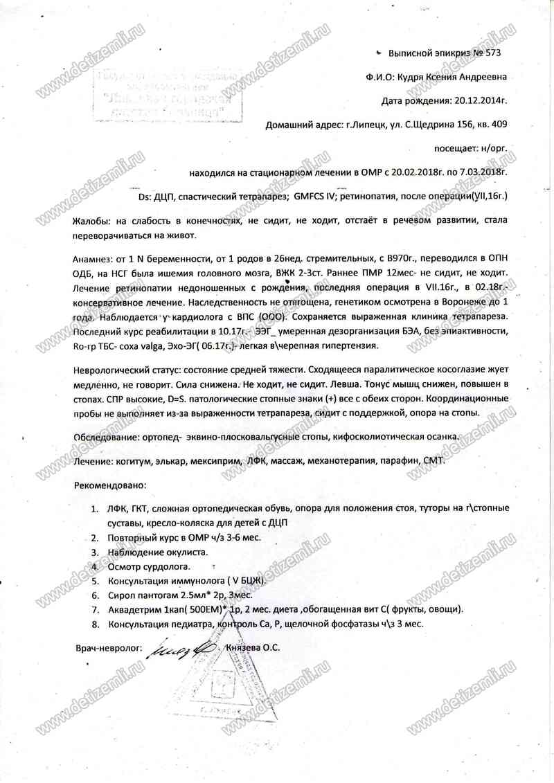 Ксения болеет детским церебральным параличом. Это заболевание требует длительного и регулярного лечения. Семья больного ребенка не в состоянии оплачивать лечение, поэтому мы обращаемся ко всем милосердным людям с просьбой о помощи. Ксении необходимо пройти курс лечения стоимостью 80000 рублей. Помогите больному ребенку!