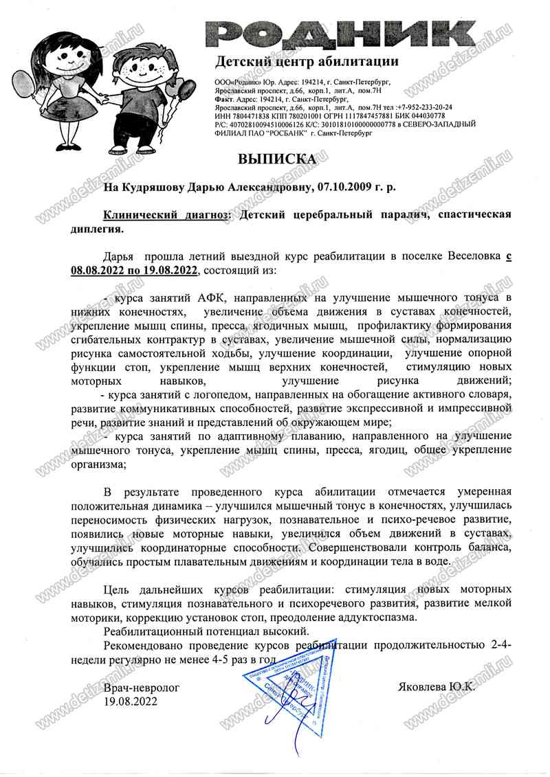 В прошлом году летом проходили лечение в детском центре абилитации «Родник» г. Санкт-Петербург. Оттуда вернулись с очень хорошими результатами. У дочери заметно снизилась спастика, улучшилось равновесие. И самое главное, научилась самостоятельно плавать. Так часто, как нам бы хотелось, невозможно там пройти лечение в связи с трудным материальным положением, но хоть раз в год, помогите, пожалуйста, исполнить нашу мечту.