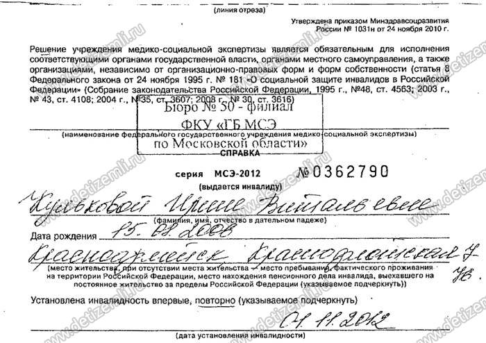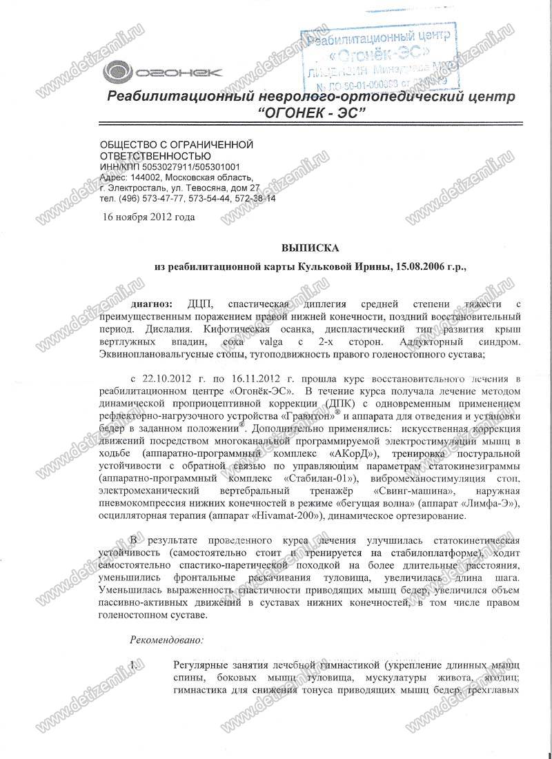 В августе 2006 г. у меня родилась тройня — мальчик Саша и две девочки Ирина и Марина. Дети родились недоношенные на 29 неделе. Мальчик покрепче, а девочки очень слабые. Ирина находилась 7 суток на ИВЛ. Два месяца находились на выхаживании в роддоме. В итоге — мальчик здоров, у девочек инвалидность. С рождения наблюдались у невролога, в 11 месяцев девочкам поставили окончательный диагноз: детский церебральный паралич. Проходили курсы лечения в разных больницах Москвы и области. Дважды делали операции по методу Ульзибата в Туле. Последний год проходим курсы лечения в РЦ «Огонек» г. Электросталь.