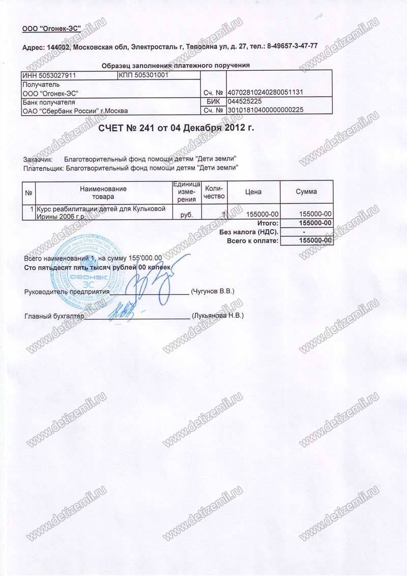 В августе 2006 в семье Кульковых родилась тройня, две девочки и мальчик. Мальчик совершенно здоров, а у сестренок детский церебральный паралич. Ирина, как и ее сестра, с самого рождения получает необходимое лечение. На данный момент она достигла заметных улучшений. На следующий год девочка пойдет в школу. Сейчас Ирине необходимо пройти курс лечения в клинике «Огонек» стоимостью 155000 рублей. Помогите ребенку нормально жить и учиться в школе, как все ее сверстники!