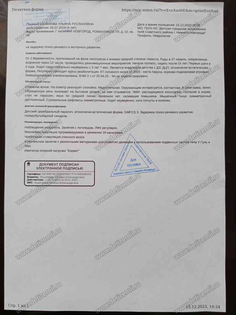 Ульяна - второй наш ребёнок. Она родилась в 8 месяцев, сама задышала, громко закричала, оценка по шкале Апгар 7/8 балов. Но через 1,5 часа состояние дочки стало ухудшаться, а через 12 часов после рождения резкое ухудшение состояния, апноэ. Ульяна перестала дышать. Переведена на ИВЛ. Далее было отделение реанимации 19 дней, а затем ещё 1 месяц в отделении недоношенных с патологиями, где дочка училась заново дышать, глотать. Прогнозы врачей были очень печальные. Случился отёк лёгких, был обнаружен врождённый порок сердца - щелевидный ДМЖП до 1 мм, не закрылся артериальный проток. Как результат гипоксии - это тяжёлое перинатальное поражение головного мозга гипоксически- ишемического генеза, постгипоксическая кардиомиопатия. И теперь жизнь Ульяны - это борьба с постгипоксическими последствиями, ставшими основной причиной ДЦП.