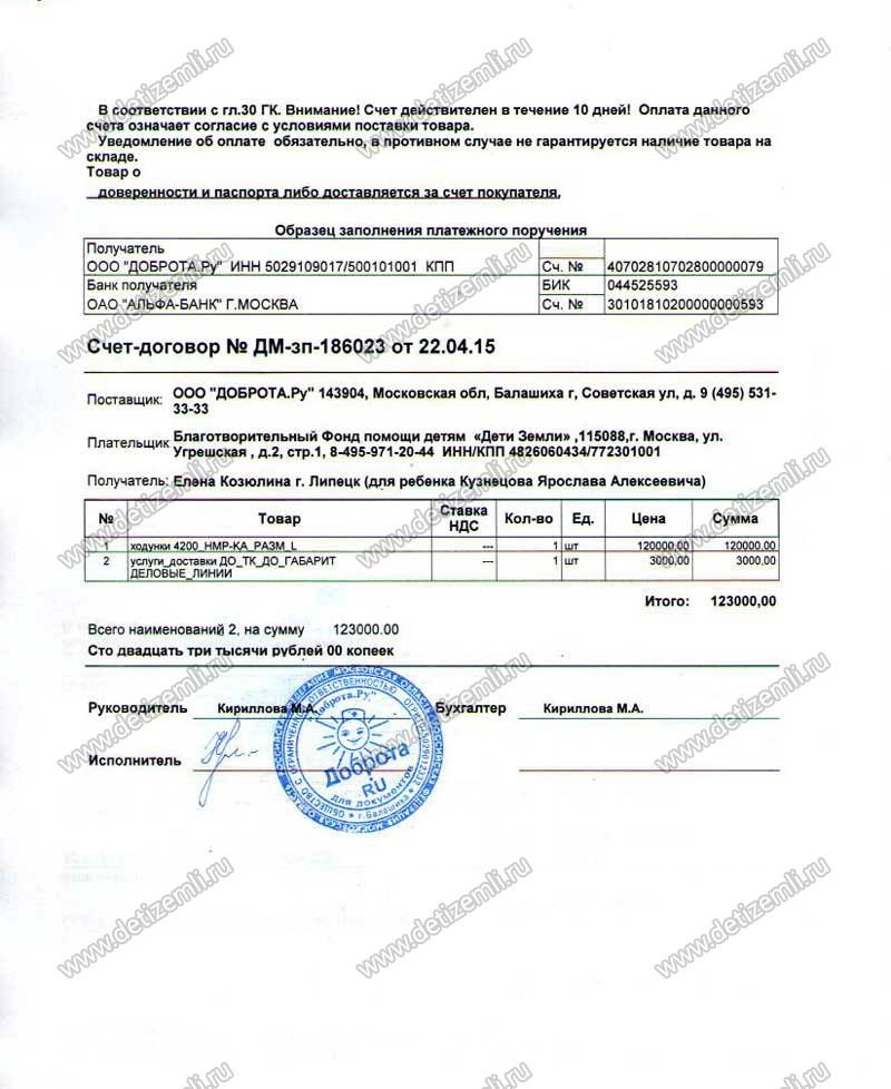 Оплачено лечение Ярослава стоимостью 123000 рублей..