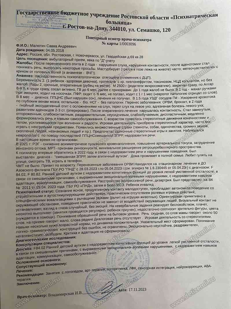 Вот наша история: родился Савва в срок и без патологий и радовал нас своим развитием до 1,5 лет. В 1,5года сыночек серьезно заболел двусторонним экссудативным отитом. Инфекция пошла в головной мозг и произошла полная потеря слуха, которую не сразу определили. И только в 2,5 года врачи определили полную потерю слуха и аденоиды 3й степени, которые перекрыли слуховой проход. Кроме того, нарушилась контактность с людьми, перестал смотреть в глаза, речь осталась на уровне годовалого ребенка (5-10 слов). После операции на аденоиды слух восстановился в 3года, но задержка развития, аутистические черты, проблемы с поведением остались, ведь потерянно было драгоценное время. С тех пор мы постоянно находимся под наблюдением врачей, проходим лечение и реабилитацию и много добились. Савва начал больше говорить, стал более контактный, начал смотреть в глаза, появились ролевые игры, нарабатываем навыки самостоятельности.
