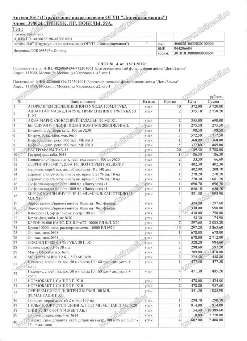 Благотворительный фонд помощи детям «Дети Земли» оплатил лекарства для больного ребенка. Благодарим наших спонсоров за помощь. Отдельная благодарность нашему другу Смирнову В. Е.
