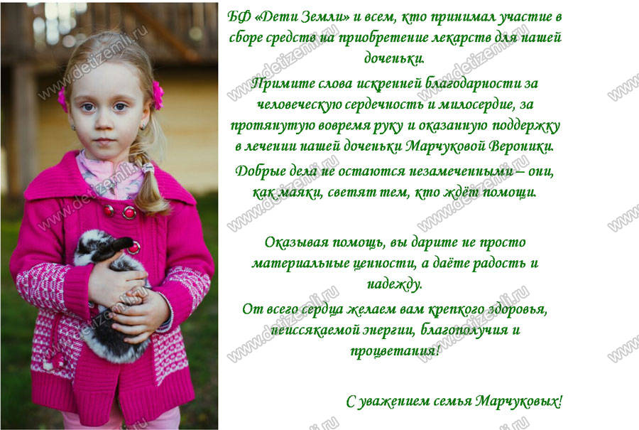 Благотворительный фонд сайта «Дети Земли» просит оказать посильную помощь ребенку больному пиелонефритом. Веронике Марчуковой срочно необходимы лекарства стоимостью 94 684,70 рублей. Помогите больному ребенку!