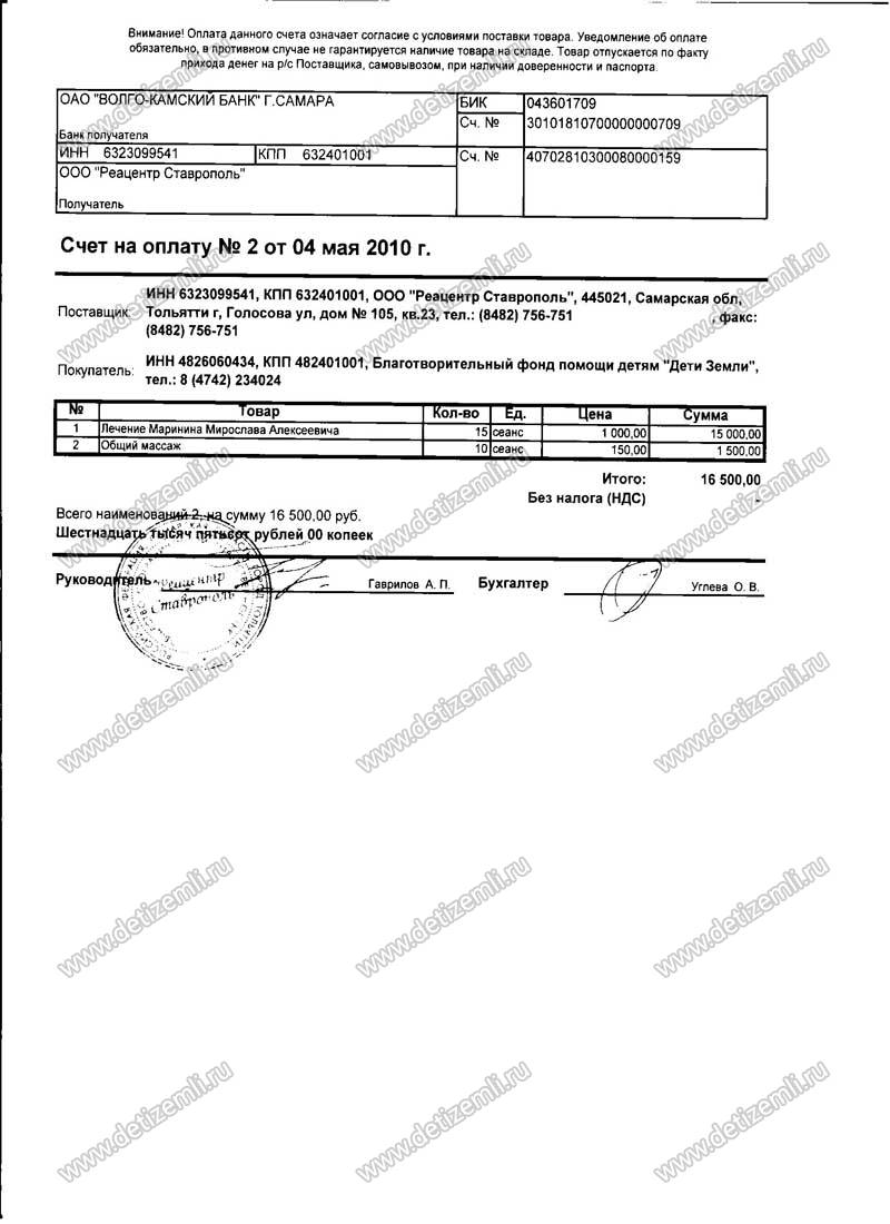 13.05.10. Оплачено лечение Маринина Мирослава в "Реацентре" г. Тольятти в сумме 16 500 рублей. Мы выражаем искреннюю благодарность нашему анонимному жертвователю, который помог оплатить лечение Мирослава. Огромное Вам спасибо!