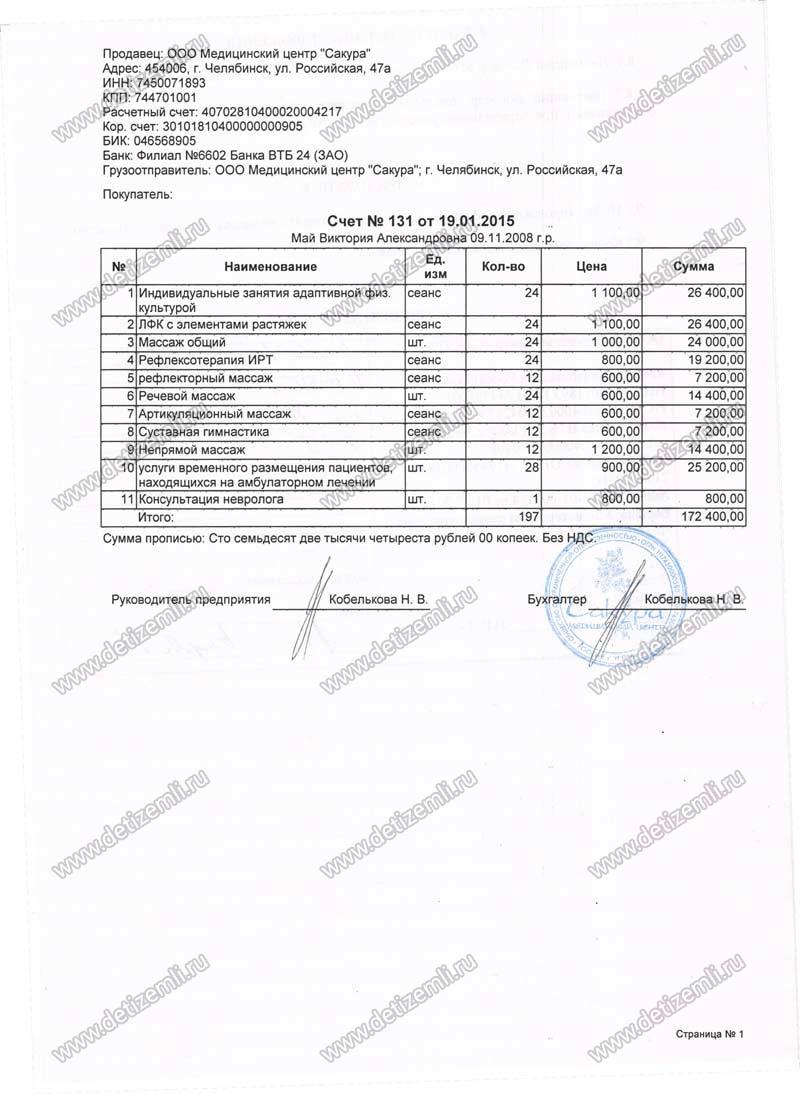 Оплачено лечение Вики стоимостью 172400 рублей.