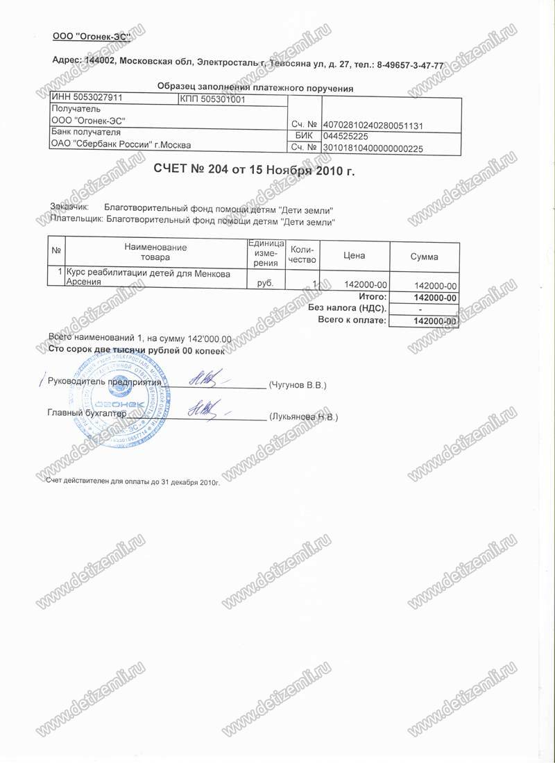 Оплачено лечение Арсения в ООО "Огонек-ЭГ" г. Электросталь на сумму 142 000 руб.