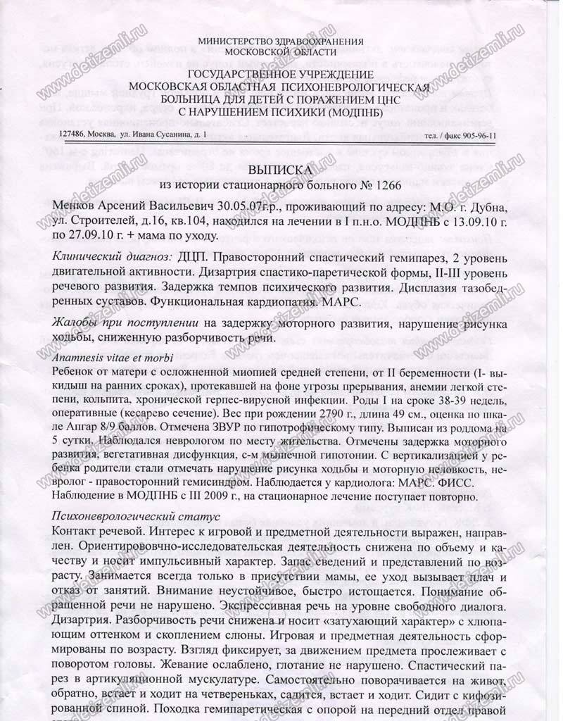 В 1,5 года Арсений стал пытаться ходить за ручки, но ноги подгибались, падал. Сидел с согнутой спиной. Только в 2 года (в Москве) ему поставили диагноз ДЦП, спастический правосторонний гемипарез.