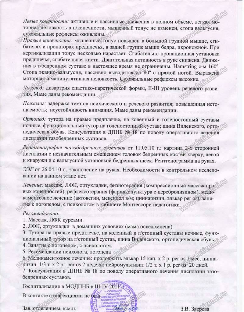 Мальчик родился в срок (было сделано кесарево), вес 2790, рост 49 см., никаких отклонений врачами замечено не было. Голову ребенок держать стал в срок, однако ползать начал только при помощи рук (по-пластунски), ноги болтались сзади как веревочки. Я стала водить его к неврологам, ортопедам, но все врачи говорили, что все в порядке, ребенок здоров.