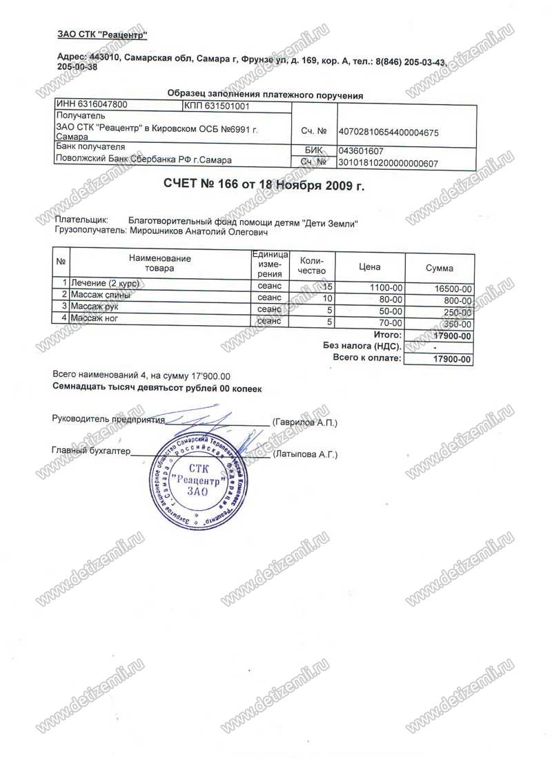 Оплачен курс лечения в "Реацентре" г. Самара стоимостью 17 900 рублей.