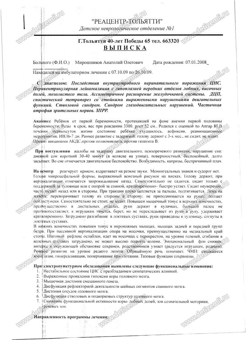 В ноябре 2009 года я обратилась к Вам с просьбой о помощи в сборе денежных средств на оплату лечения моего сына Мирошникова Анатолия в Самарском терапевтическом комплексе «Реацентр».