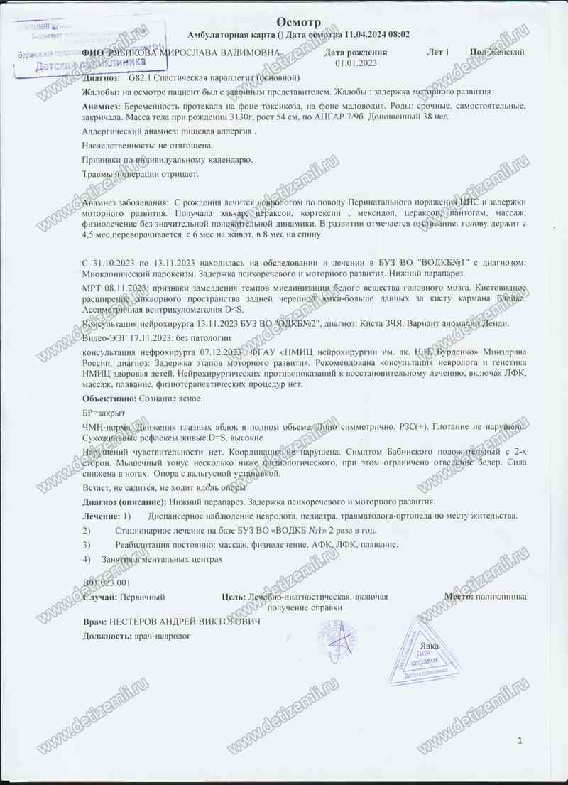 Мирослава родилась в срок, на 38 неделе, в нормальном весе для девочек, но потом начала терять вес, у нее был плохой аппетит. После выписки домой , ситуация не сильно улучшилась , она так же плохо кушала , не кричала громко, не требовала кушать, приходившие бабушки отмечали что у нас очень удобный спокойный малыш, единственное, что могло ребенка тогда вывести на эмоции это колики. Потом по мере ее развития неврологи и мы стали отмечать, что она развивается с задержкой, снижена чувствительность конечностей, ребенок не эмоционален. Врачи поликлиники не били сильную тревогу, но к 10 месяцам я как мама решила лечь на обследование в детскую больницу, отделение неврологии. После выписки нам как гром среди ясного неба был поставлен диагноз парапарез, в больнице из лечения был глицин, магне Б6. Дальше был проделан путь по поиску неврологов, клиник, вариантов адекватного лечения. Были разные страшные диагнозы, которые как приговор били по нашей семье. Мы как любящие родители хотели быстрее помочь своему ребенку реабилитироваться. В процессе исследований и анализов было выявлено, что у Мирославы нарушен обмен жиров, они не усваиваются, ацидурия, гиперамонемия, ребенок находится в постоянной сильной интоксикации, страдают многие системы и органы, мышцы, мозг, почки, печень, поджелудочная железа, кишечник, нарушен метаболизм, система детоксикации. У ребенка истощение надпочечников, и напряжена иммунная система. Ребенок плохо набирает вес, быстро утомляется, и медленно развивается. Нельзя исключить того, что есть генетическая поломка, но пока мы ее не смогли найти. Точнее врачи настаивают что поломка есть! Мы находимся еще на пути выяснения причин, способов их решения параллельно поддерживая ее метаболизм и иммунную систему. Мирослава 1 год 5 мес. еще не сидит без опоры, но активно ползает на четвереньках, встает опоры, она улыбчивый любознательный ребенок. Пока она маленькая, мы хотим приложить все силы чтобы помочь ей восстановится и вести полноценную жизнь и развиваться как все здоровые малыши. На данный момент мы проходим реабилитацию ЛФК, проходим лечение у иммунолога, невролога, гастроэнтеролога. К слову, как раз на реабилитации нам подсказали, что можно обратиться в Ваш фонд. Все консультации, анализы, лекарства, реабилитации не дешевые. В ближайшее время потребуется сдать полное секвенирование генома по заключению генетика. Я мама в декрете, есть еще второй ребенок, нам сложно потянуть финансово все эти расходы, поэтому просим Вас не оставаться равнодушными к нашей ситуации и помочь нашей девочке.