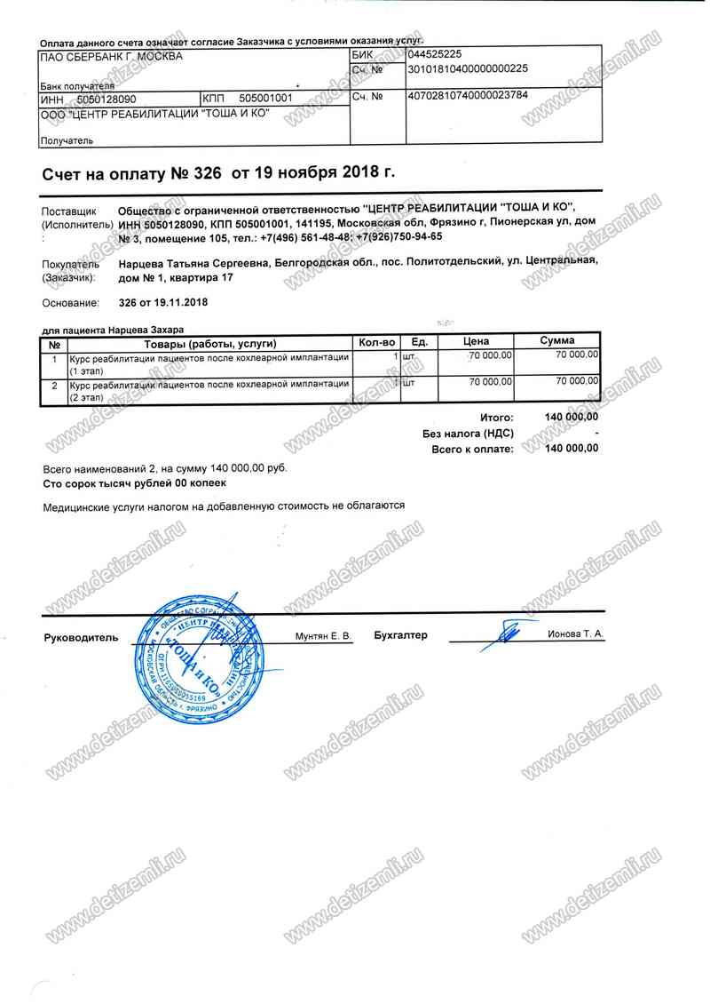 Оплачено лечение Захара стоимостью 140000 рублей.