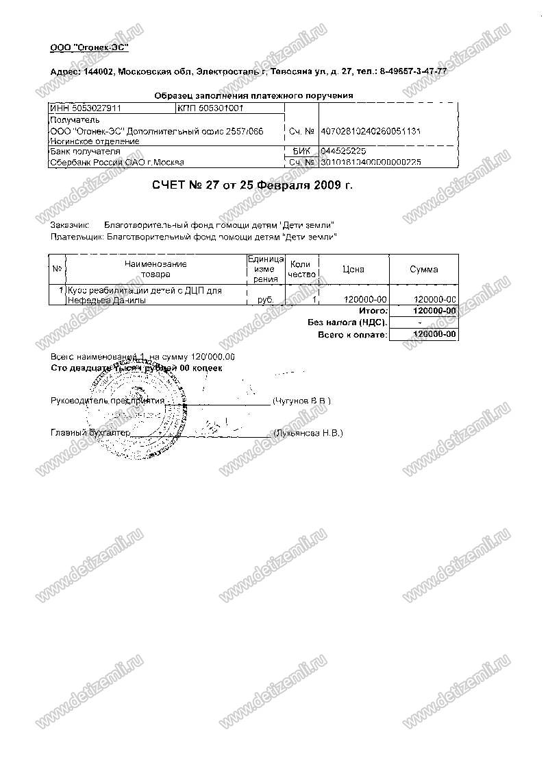 Оплачен курс лечения в НПЦ "Огонек" в сумме 100 000 рублей.