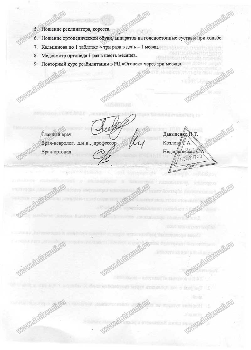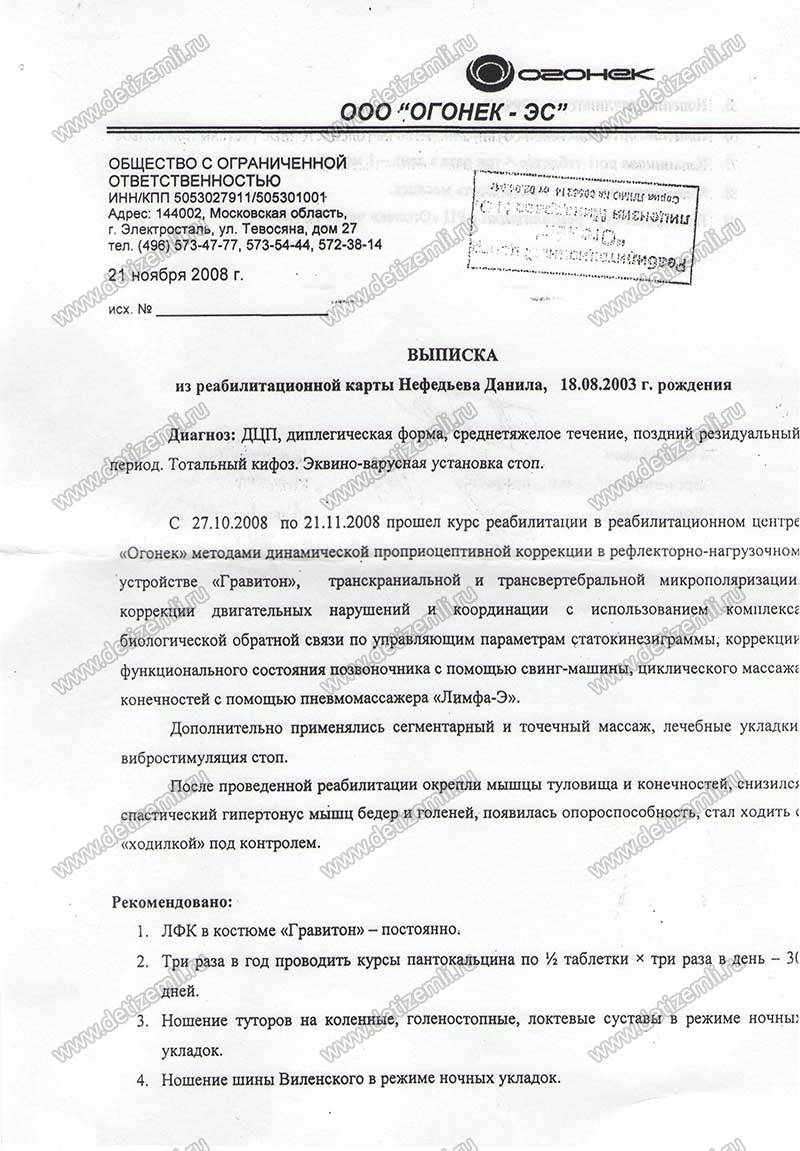 11.01.2010. Оплачено лечение Данилы Нефедьева в реабилитационном центре ООО "Огонек-ЭС" в г. Электросталь Московской области. Лечение будет проводиться с использованием рефлекторно-нагрузочного устройства "Гравистат". Мальчик уже проходил в этом центре курс лечения. Врачи отмечают, что ребенок с хорошим потенциалом восстановления. Мы вместе с мамой Екатериной Викторовной надеемся, что Данила сможет встать на ноги и пойти в школу со своими сверстниками.