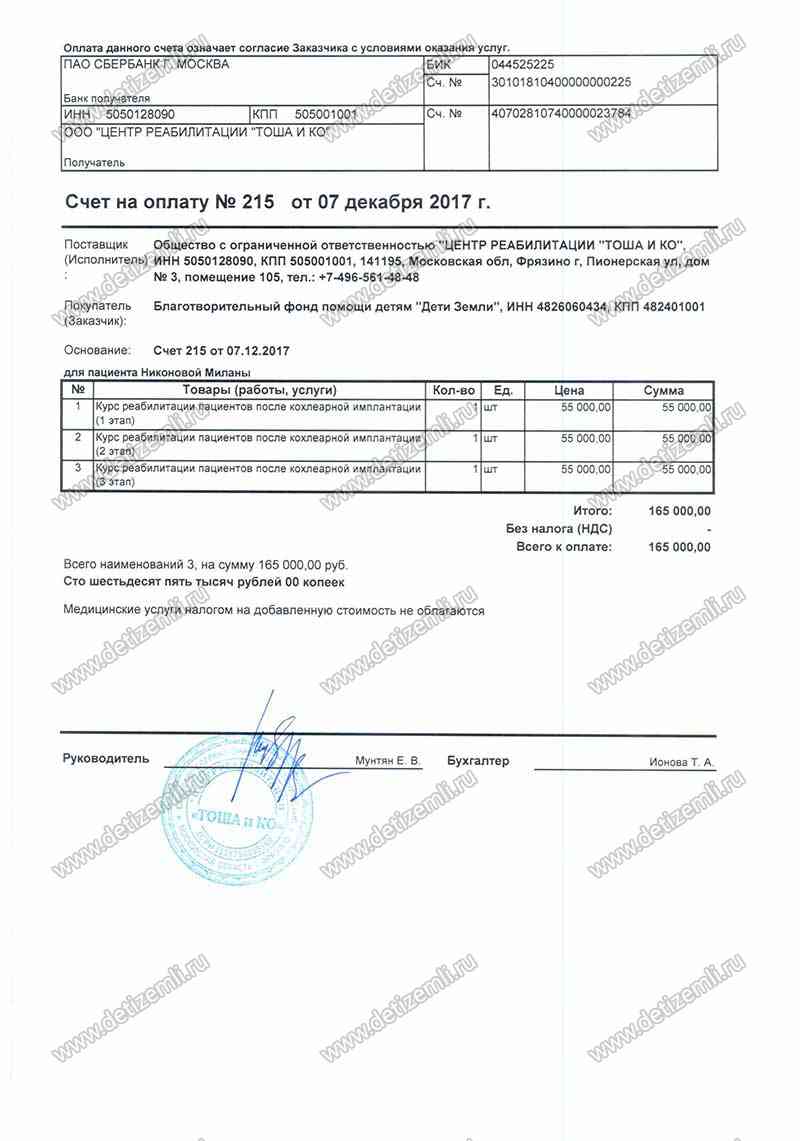 Оплачено лечение Миланы стоимостью 165000 рублей.