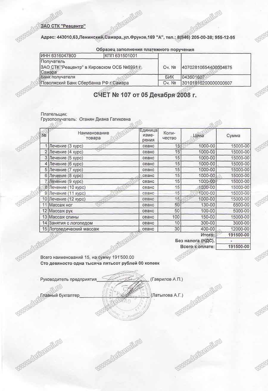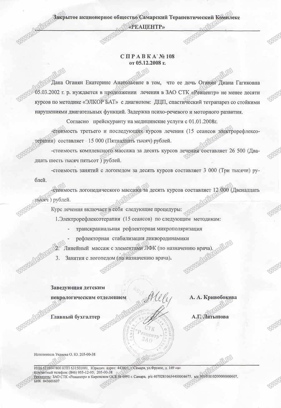 Оплачен один курс лечения Дианы в "Реацентре" стоимостью 19 150 рублей.