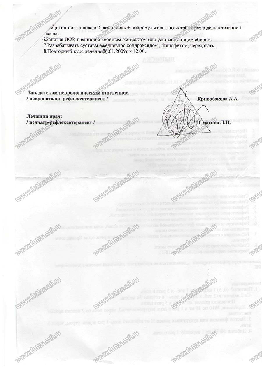 31.03.09. Начат курс лечения в Самарском терапевтическом комплексе "Реацентр" Дианы Оганян. Это лечение аппаратом "Элкор/МЭКС", массажи спины и занятия с логопедом. Мы желаем Диане новых побед над болезнью!