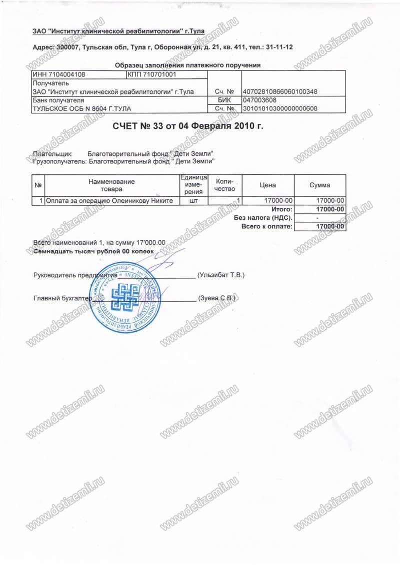 Оплачено лечение Никиты в г. Тула стоимостью 17 000 рублей