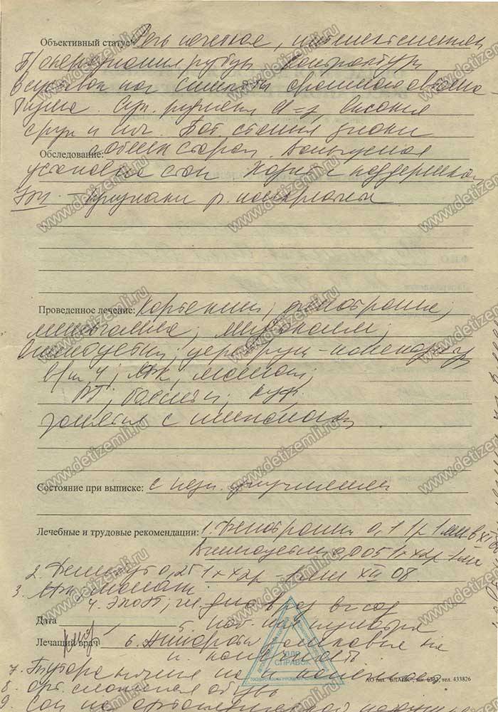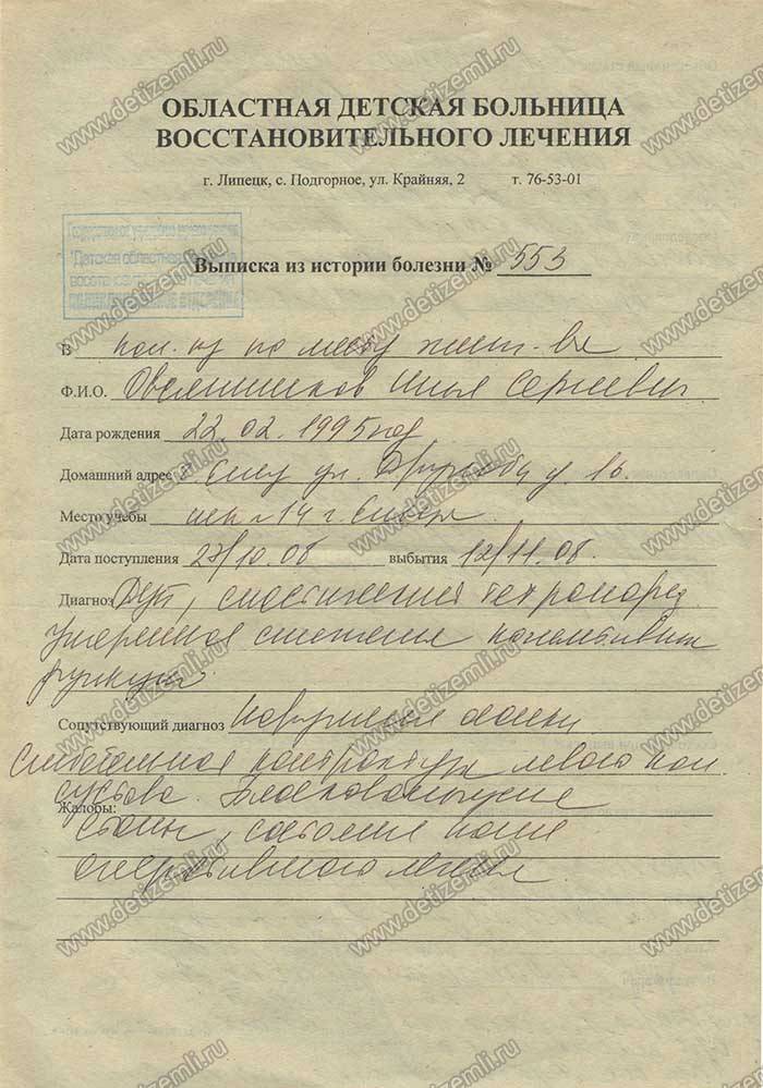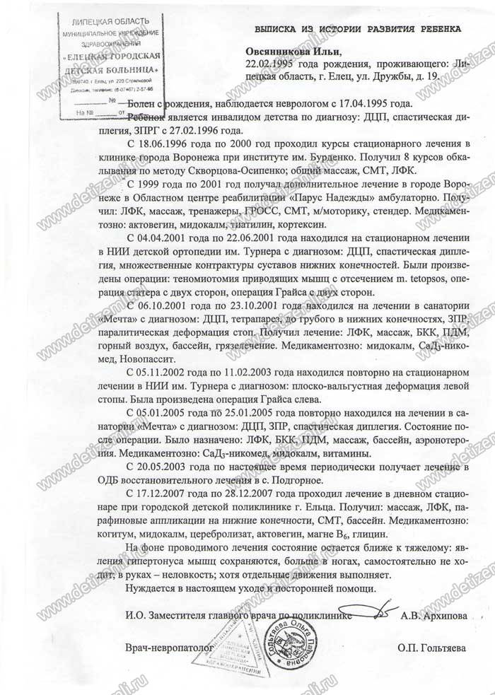 Первые 2 курса лечения мы прошли в Областной детской больнице г. Липецка. Потом, начиная с возраста 1,5 лет с 1986 г. по 2000г. систематически, раз в три месяца, проходили курсы лечения обкалыванием в клинике при институте им. Бурденко г. Воронежа. Это была невыносимая боль, кажущаяся пытками. Но мы это выдержали! Попутно с 1999г. по 2001г. получали дополнительное лечение в Областном Воронежском центре реабилитации "Парус Надежды". Но все эти меры побороть болезнь были недостаточными. Она никак не хотела сдавать своих позиций. Более того , она безжалостно продолжала скрючивать руки и ноги, деформируя суставы, особенно ног. И тогда в возрасте 6 лет, мы решились на операцию. Узнали, что в г. Пушкине Санкт - Петербургской обл. есть замечательный НИИ им. Турнера.