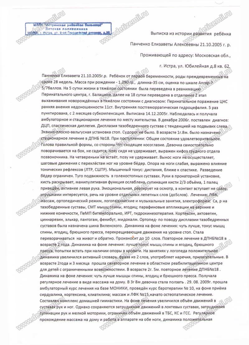 Здравствуйте, меня зовут Панченко Ирина. Обращаюсь к Вам с огромной просьбой о помощи. Осенью 2005 года на 28 неделе беременности у меня родилась дочь Панченко Елизавета весом ЭОО грамм. Роды были тяжёлые, при рождении у девочки случилось кровоизлияния головного мозга. Лиза самостоятельно не дышала, полтора месяца была на ИВЛ, Два месяца, её выхаживали врачи Перинатального центра г. Балашихи. Выписали с диагнозом «Перинатальное поражение центральной нервной системы». Дома делали массаж, гимнастику, медикаментозное лечение. Когда Лизе было 1 год, попадаем в областную больницу, где нам ставят страшный диагноз ДЦП. И мы начинаем свой путь лечения, ездили в различные лечебные учреждения, регулярно делали массаж и гимнастику, по возможности проходили курс иглотерапии, курс баротерапии, но хороших результатов было мало, а если были, то недолгие.