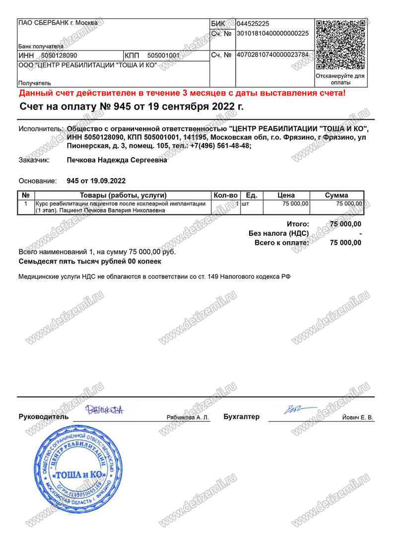 Оплачено лечение Леры стоимостью 75000 рублей.