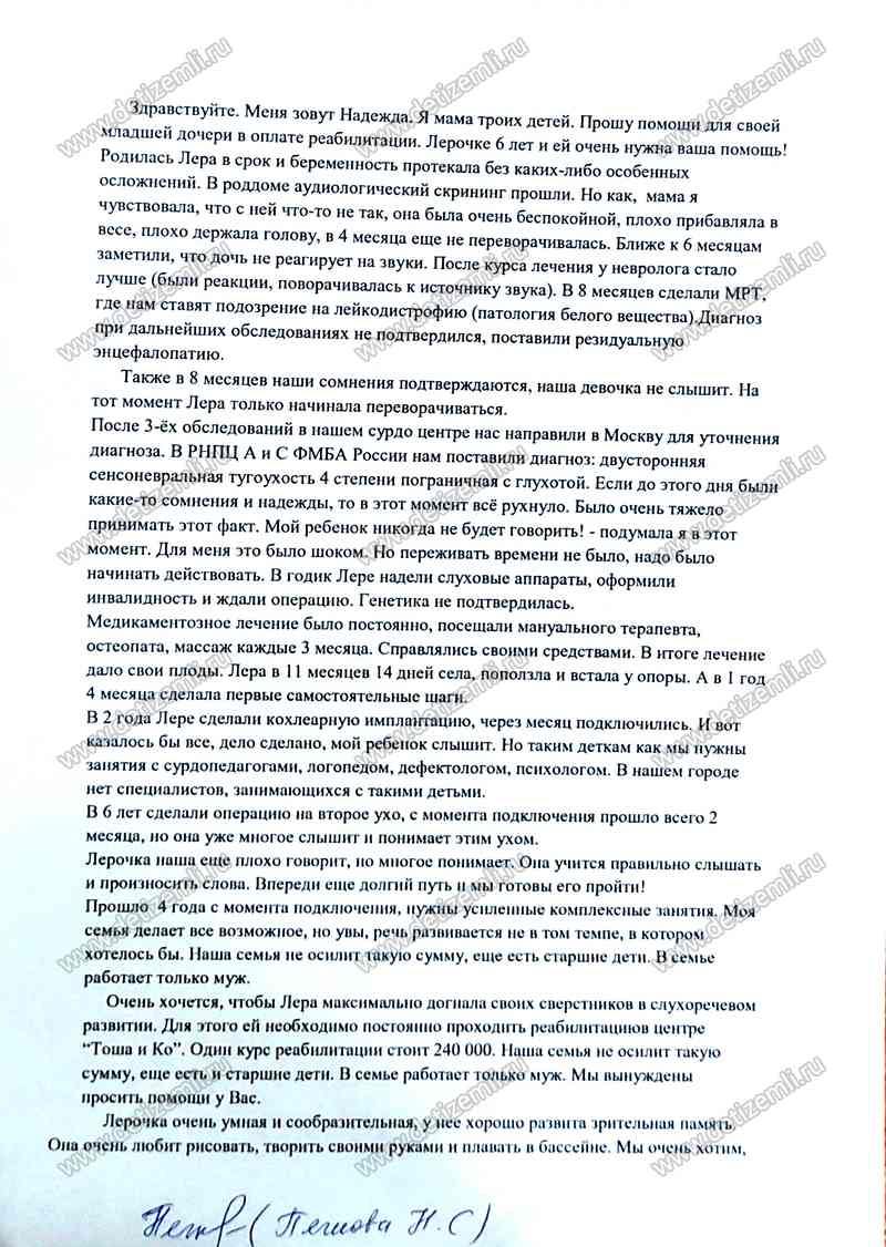 Здравствуйте. Меня зовут Надежда. Я мама троих детей. Прошу помощи для своей младшей дочери в оплате реабилитации. Лерочке 6 лет и ей очень нужна ваша помощь!