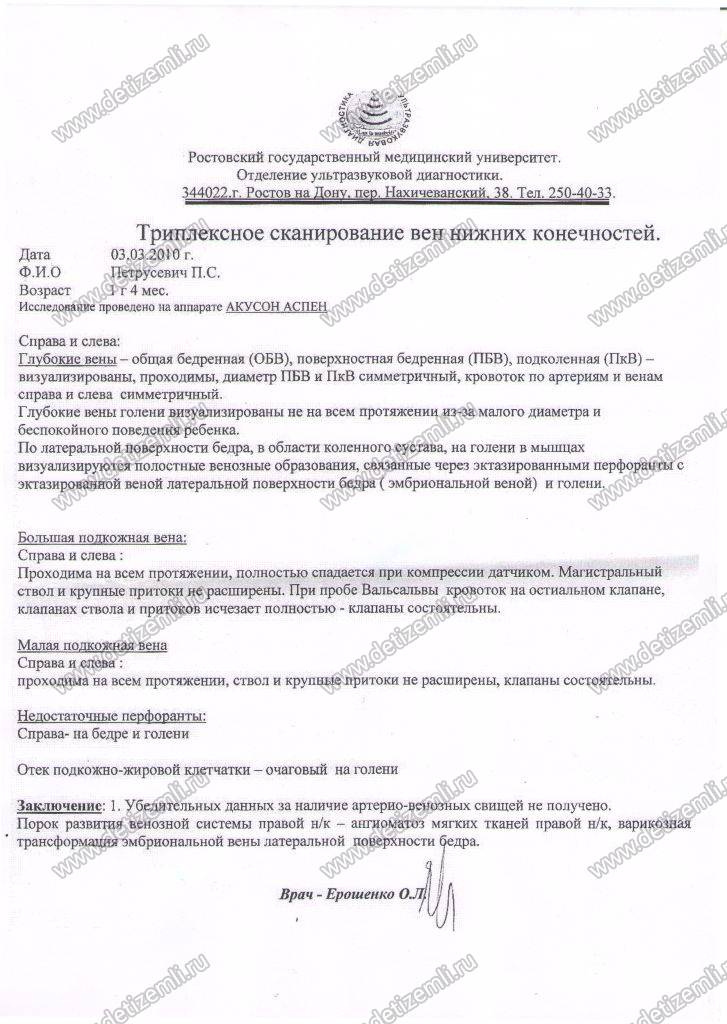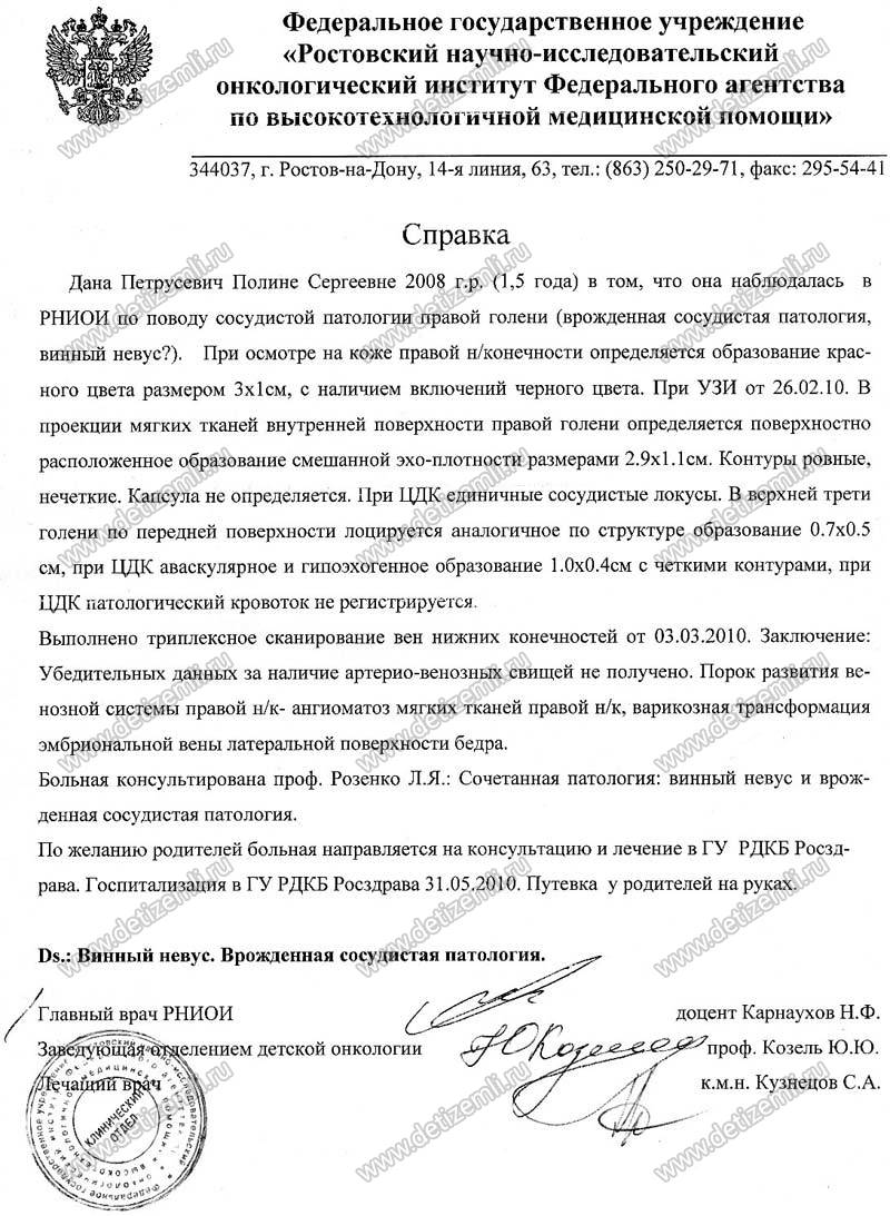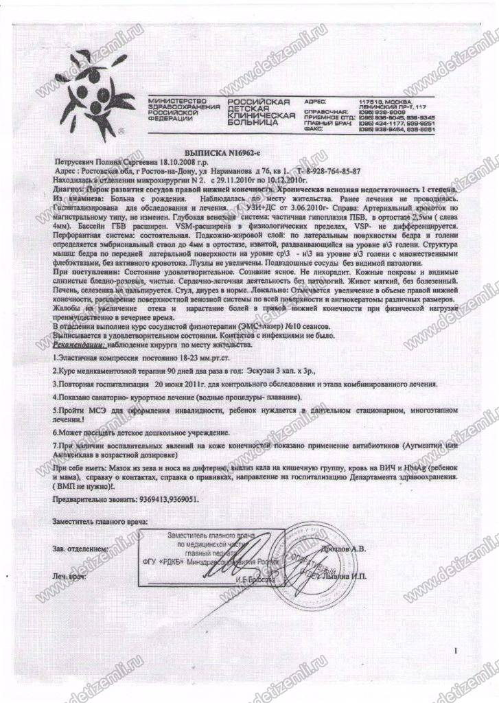 Здравствуйте! Моя дочурка родилась в срок 18 октября 2008 г. С пороком развития венозной системы правой нижней конечности. До годика нам не могли поставить правильный диагноз. С рождения Полину поставили на учет в Ростовский онкологический институт, с диагнозом гемангиома. У Полины на больной коленке была пульсирующая поверхностная вена, которая к 6 месяцам начала кровоточить и увеличиваться в размерах. Врачи-онкологи не предлагали никакого лечения, так, как наш порок не их специализации. У активной полугодовалой девочки, каждый день открывалось венозное кровотечение. Мы поехали на консультацию в областную больницу г.