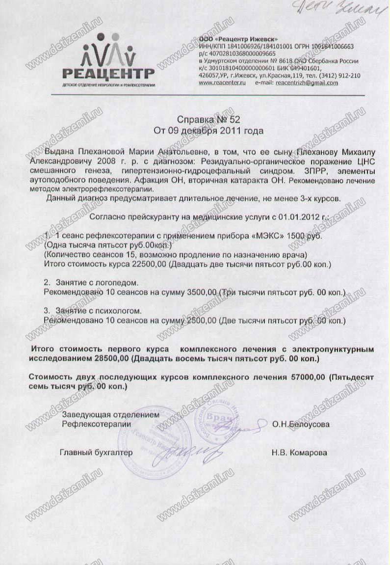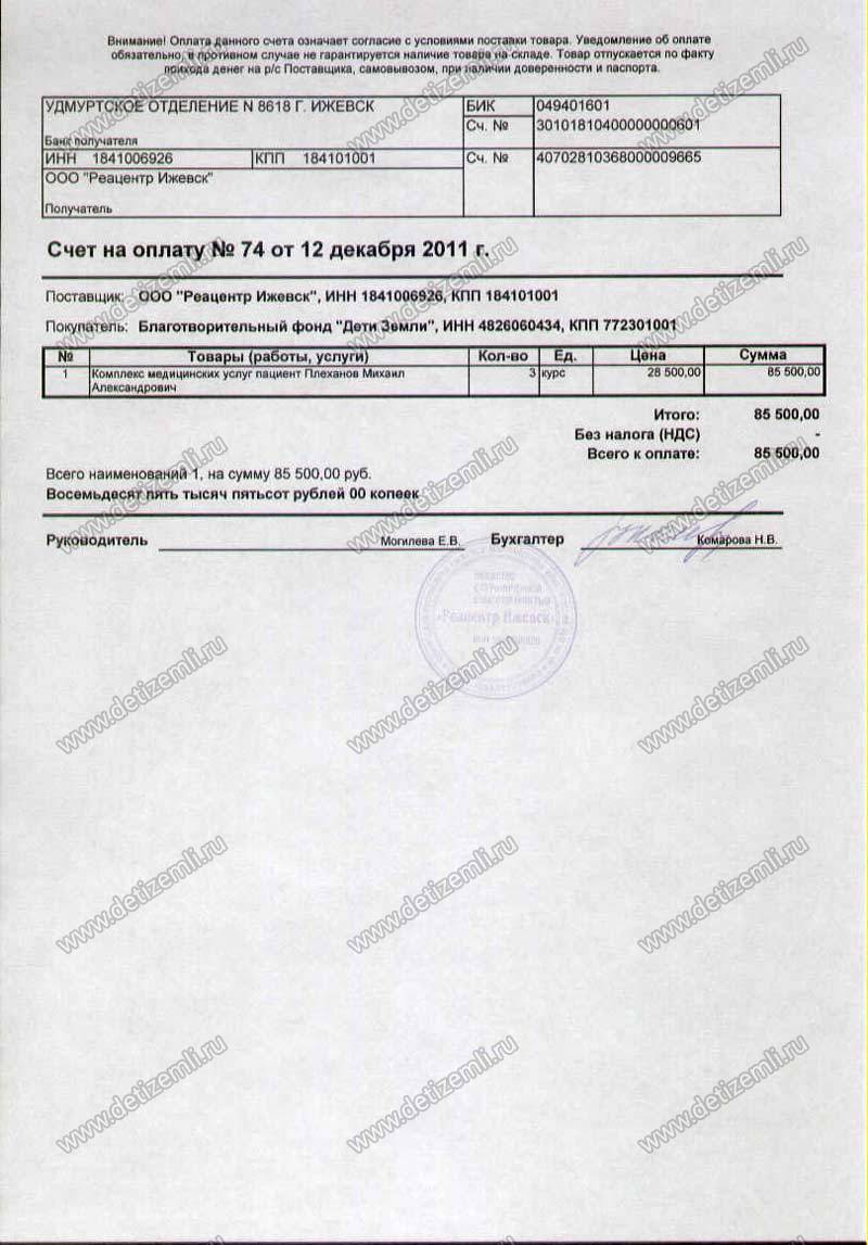 Оплачено лечение Миши в ООО "Реацентр" стоимостью 85500 рублей