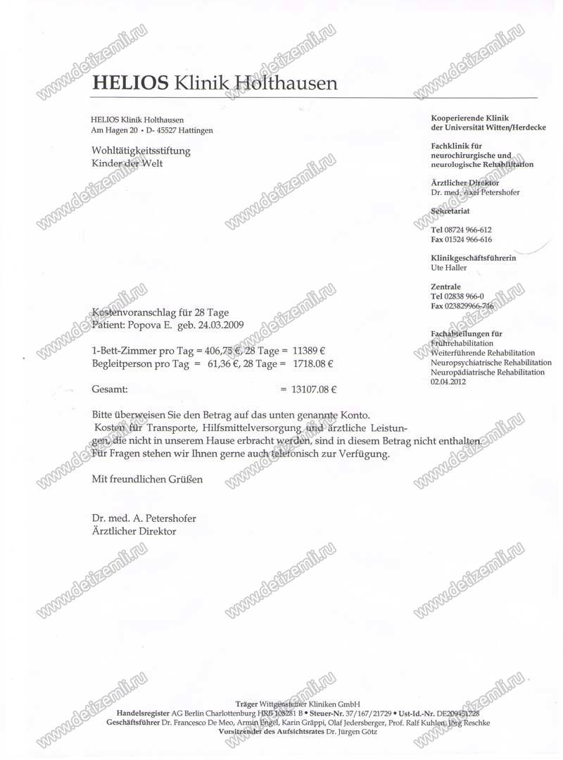 Оплачено лечение в клинике Германии стоимостью 13 107,08 евро