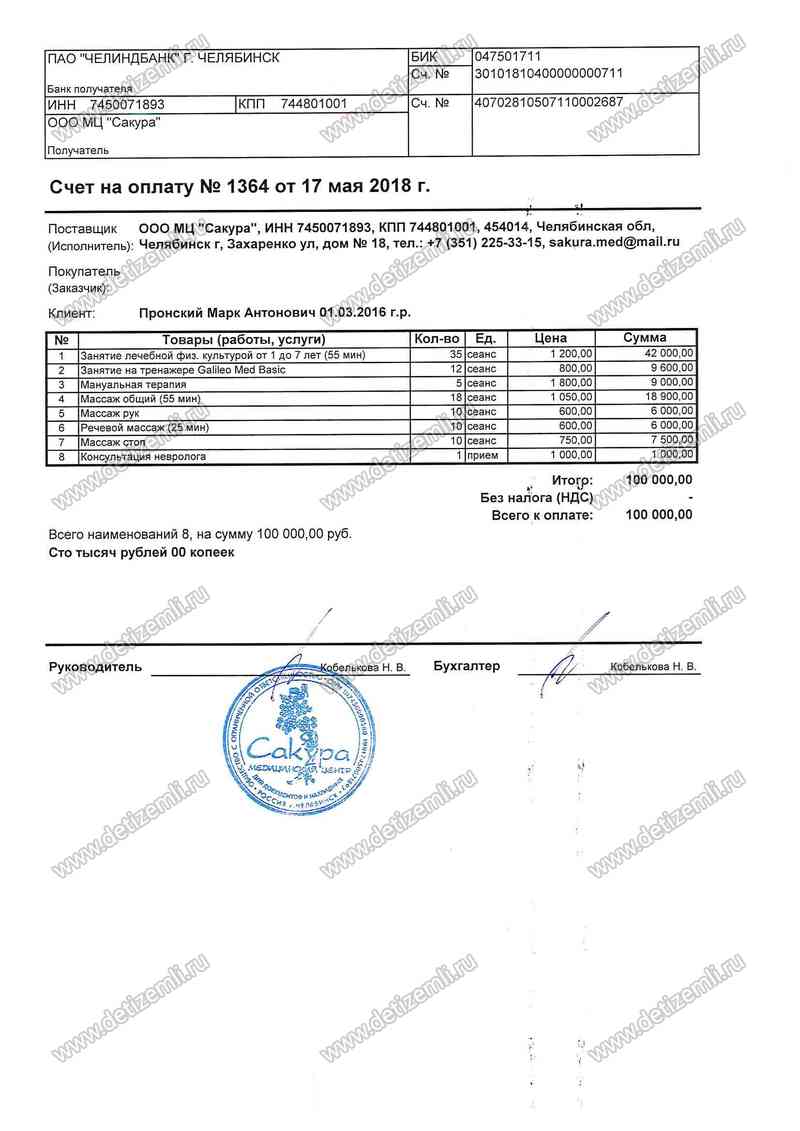 Оплачено лечение Марка стоимостью 100000 рублей.