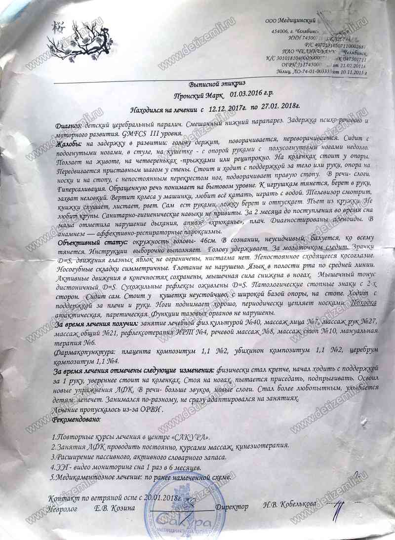 Благотворительный фонд помощи детям «Дети Земли» оплатил лечение Марка стоимостью 100000 рублей. Благодарим за помощь спонсоров и волонтеров!