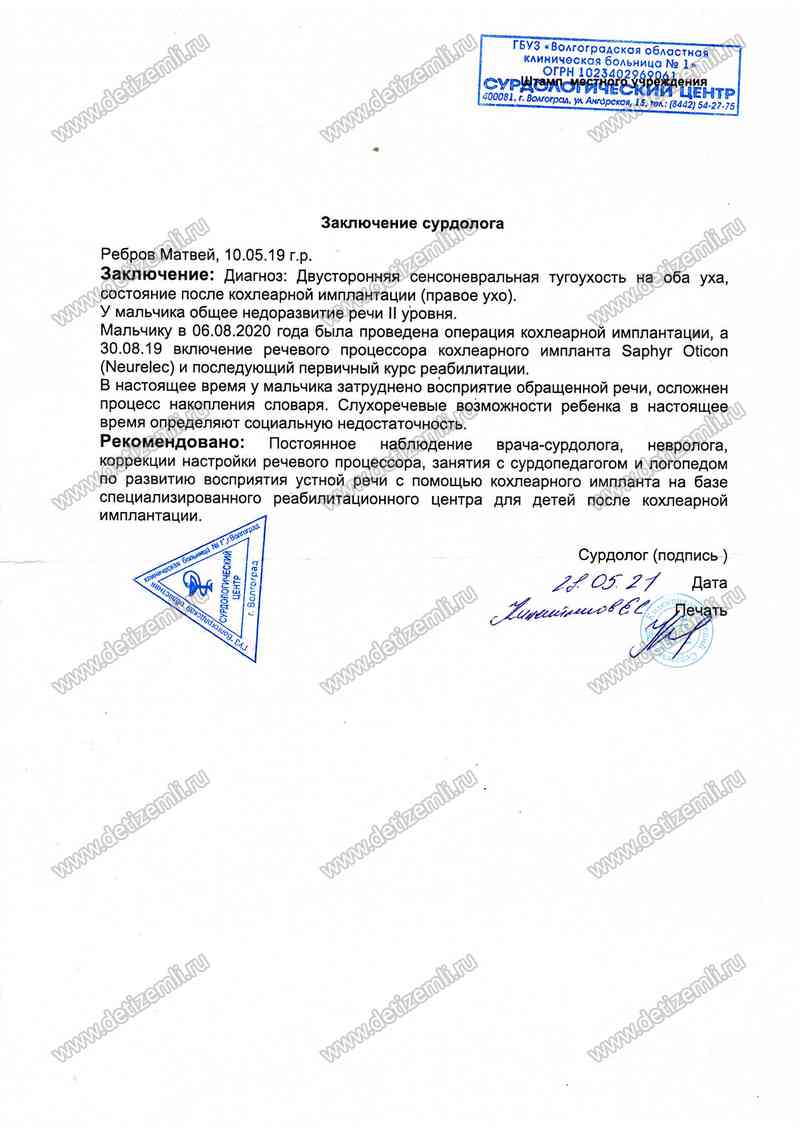 Благотворительный фонд помощи детям «Дети Земли» оплатил лечение Матвея стоимостью 75000 рублей. Желаем успехов Матвею в лечении!