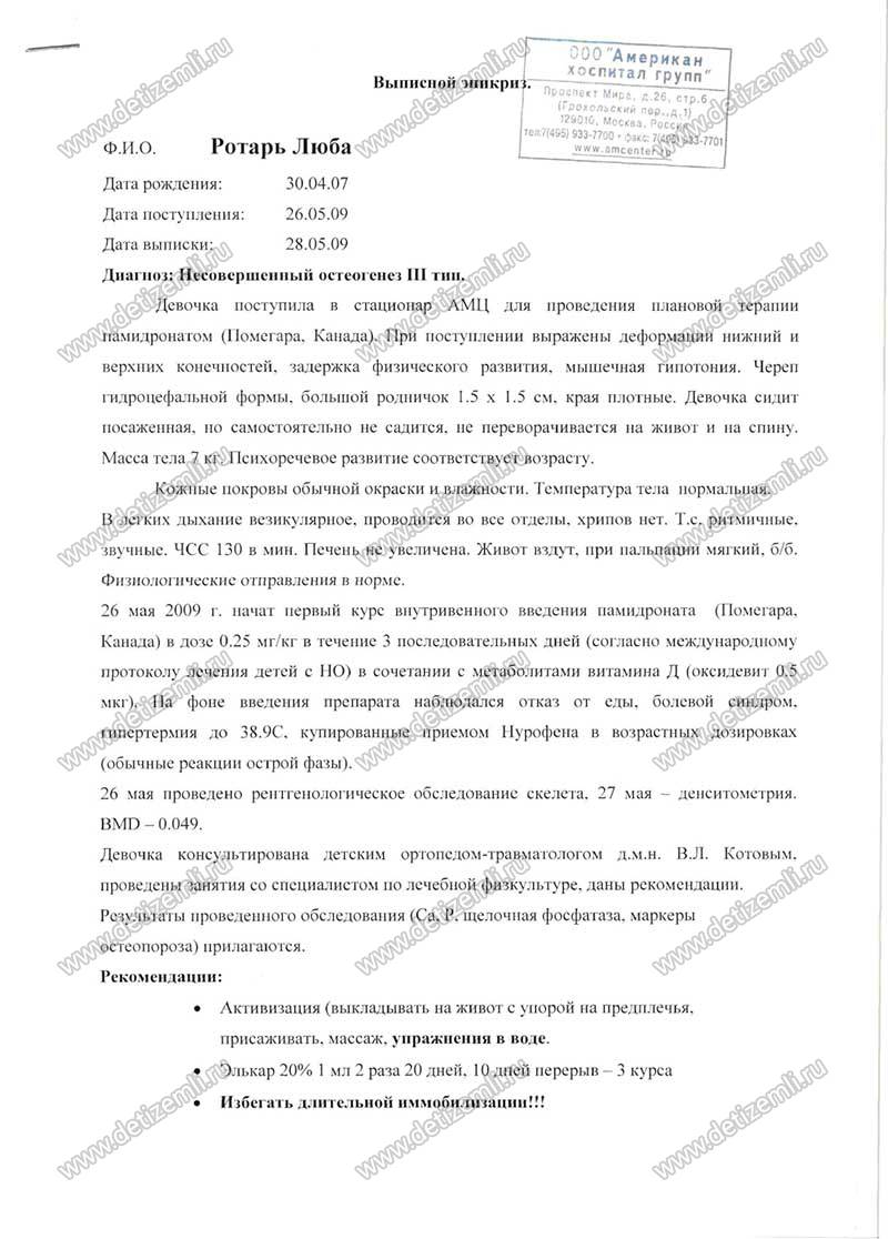 Меня зовут Ротарь Алла, мне 26 лет, и у меня двое чудных детишек, сын Станислав 7 лет и дочка Любочка - 2 годика. Именно Любе с рождения был поставлен страшный диагноз «несовершенный остеогенез», если сказать более простыми словами «хрустальный человек» или «ломкость костей». За эти 2 годика у Любаши было уже 14 переломов. D основном это руки и ноги. Она сидит, но не стоит и не ходит. Нам срочно нужны дорогостоящие курсы лечения в г. Москва «Американский медицинский центр», нам необходимо 4 курса в год с интервалом 3 месяца на протяжении 2-х лет, один курс лечения стоит 70 000 рублей РФ. У нас в семье работает только муж, зарплата у него 5,5 тыс. рублей РФ и пенсия дочки 1,5 тыс. рублей РФ и денег к сожалению не хватает на лечение дочки. Помогите пожалуйста моей дочке встать на ножки, лечения в Американском медцентре приносят очень хорошие результаты. Спасибо всем тем кто помогает детям. Заранее благодарю всех тех кто поможет моей дочке!