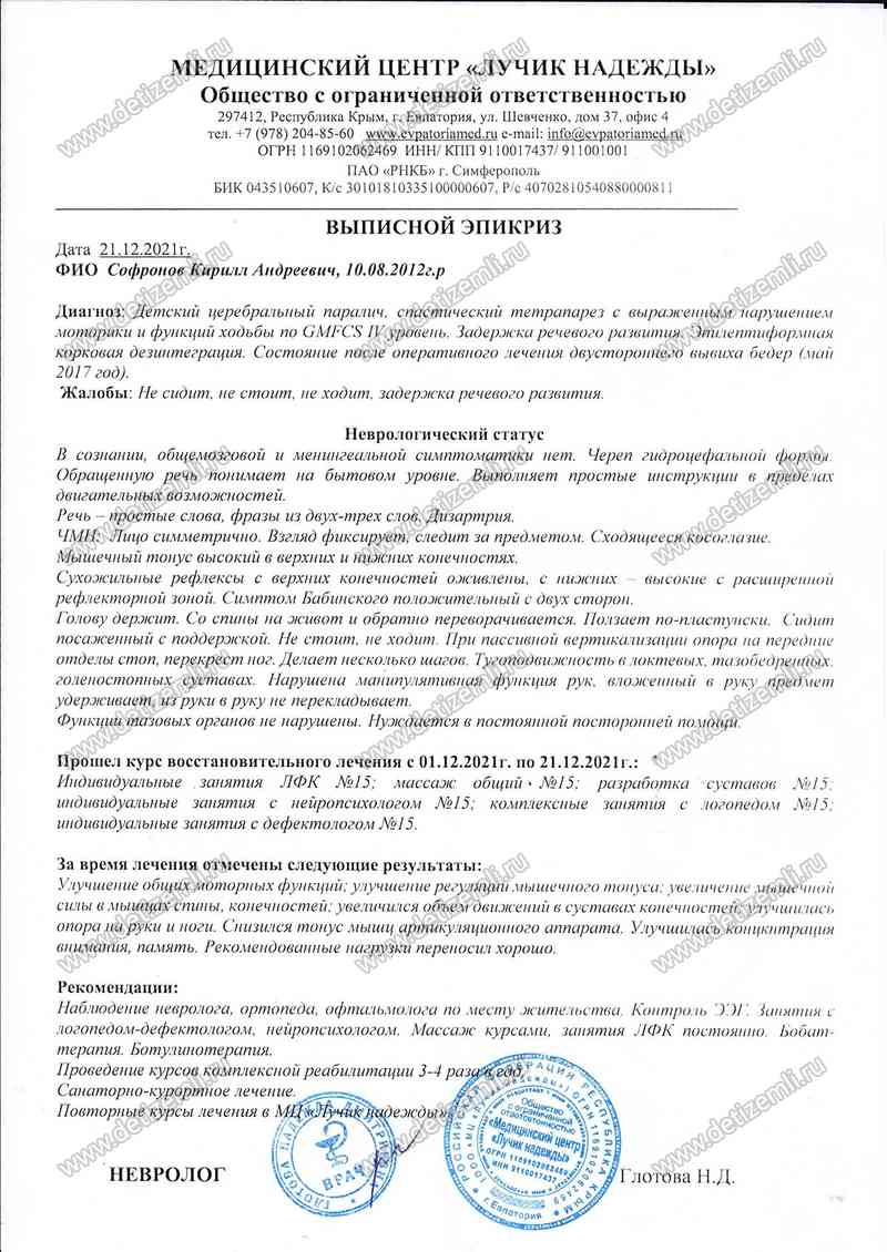 Здравствуйте! Пишу вам с благодарностью,что вы нам дали ещё один шанс пройти наш очередной курс реабилитации. Наши занятия прошли как всегда продуктивно, Кристиночка научилась сама подыматься и сидеть,и это просто счастье,словарный запас увеличился, понимания стало больше. Кирюша наш конечно больше умственно движется вперёд, может сам посчитать , знает буквы, а вот физически конечно ему тяжелее, но он не сдаётся и всегда старается выполнить все упражнения,немного научился сам сидеть без поддержки.Спасибо вам огромное, что вы даёте нам шанс приблизиться к нашей цели!!!