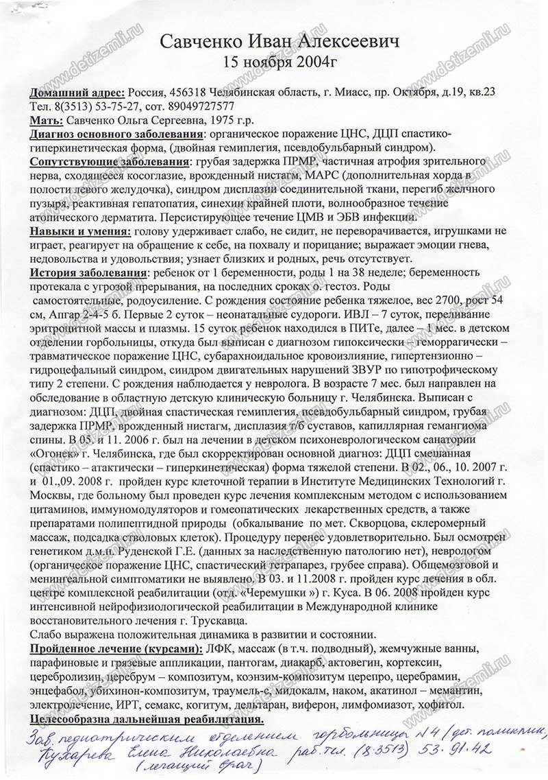 Наш сын Ванечка тяжело болен с рождения (ДЦП как следствие родовой травмы). С самых первых минут появления малыша на свет мы боремся за его жизнь и здоровье. Неделю Ванюша был в коме, балансировал на грани жизни и смерти, был и аппарат искусственной вентиляции легких, и неоднократное переливание крови... Не знаю, как мы это пережили, но всё потихоньку стабилизировалось; казалось, что страшное уже позади, а в 8 месяцев нам поставили диагноз ДЦП и ненавязчиво предложили отказаться от малыша как неперспективного и нежизнеспособного. Мир рухнул во 2-ой раз, земля уходила из-под ног, горю не было предела, но руки опускать было нельзя: ведь кто, если не родители позаботятся о таком «нестандартном» ребенке?!, кто, если не мать будет «биться» до последнего, чтобы поставить своё чадо в прямом и переносном смысле «на ноги»?! Всё это время и мы «бьёмся» за малейшие сдвиги в здоровье нашего сына. Что только мы не предпринимали, какие лекарства и методы лечения не пробовали, но значительных улучшений пока нет. (Прошли 5 курсов клеточной терапии в Москве, были на реабилитации в Трускавце.) Появились проблески лишь в эмоциональном плане, а в физическом (двигательном) всё осталось почти на прежнем уровне. Ванюша плохо удерживает голову, не переворачивается, не ползает, не сидит, не ходит, не разговаривает, но всё понимает, эмоционально реагирует на происходящие события вокруг себя. Специалисты-неврологи говорят, что надо пробовать в лечении ребенка «всё», «всё, что по карману». Кто сталкивался с подобной проблемой, тот знает, что лечение такого заболевания как ДЦП, стоит немалых средств и усилий.