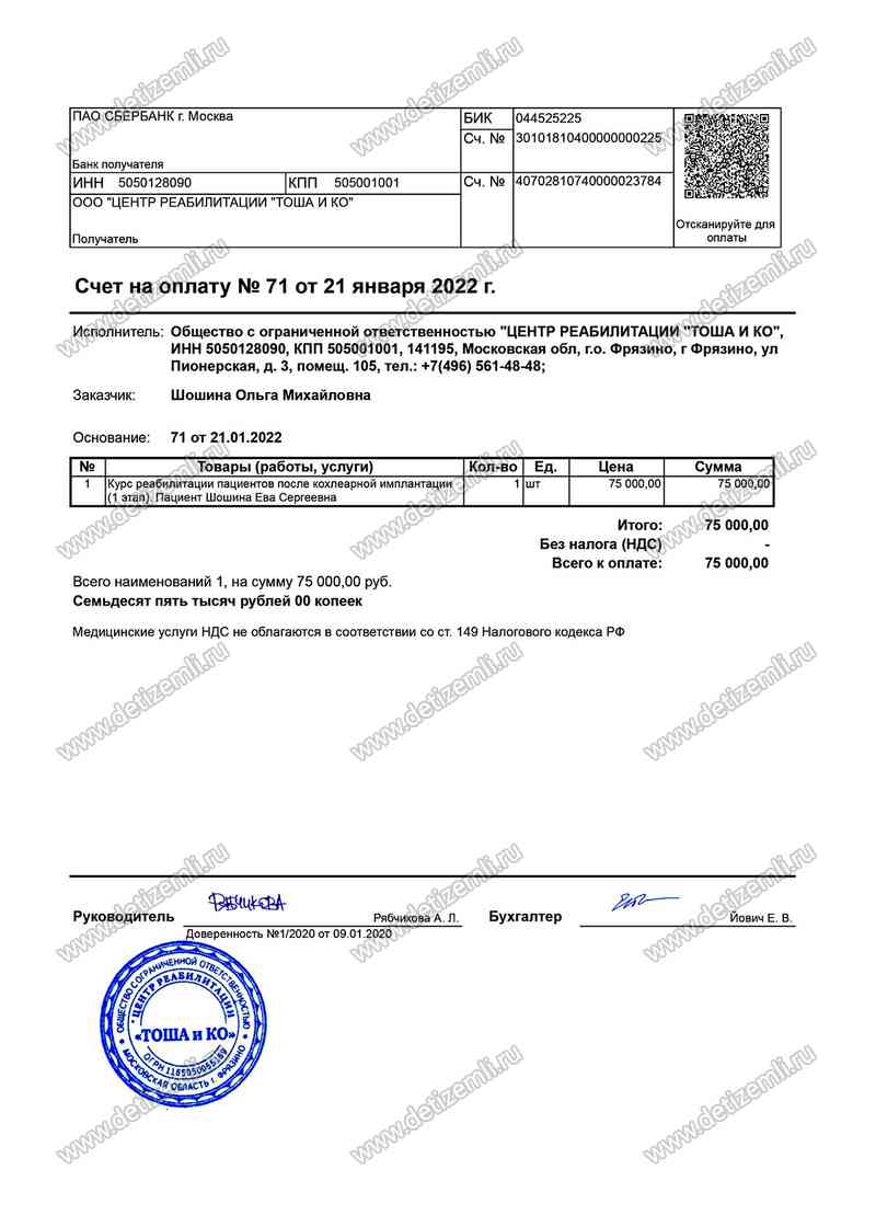 Оплачено лечение стоимостью 75000 рублей.
