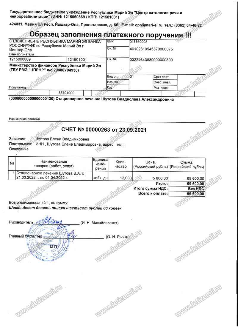 Оплачено лечение стоимостью 69600 рублей
