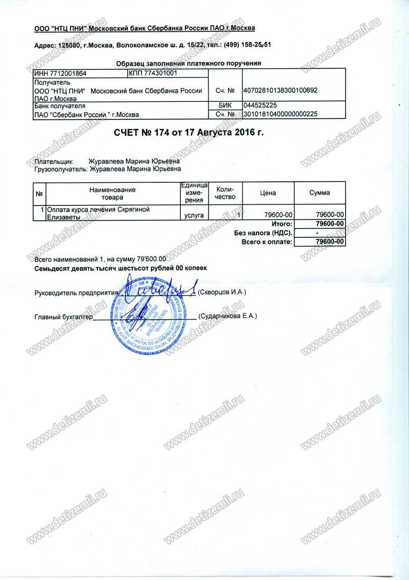 Оплачено лечение Лизы стоимостью 79600 рублей.