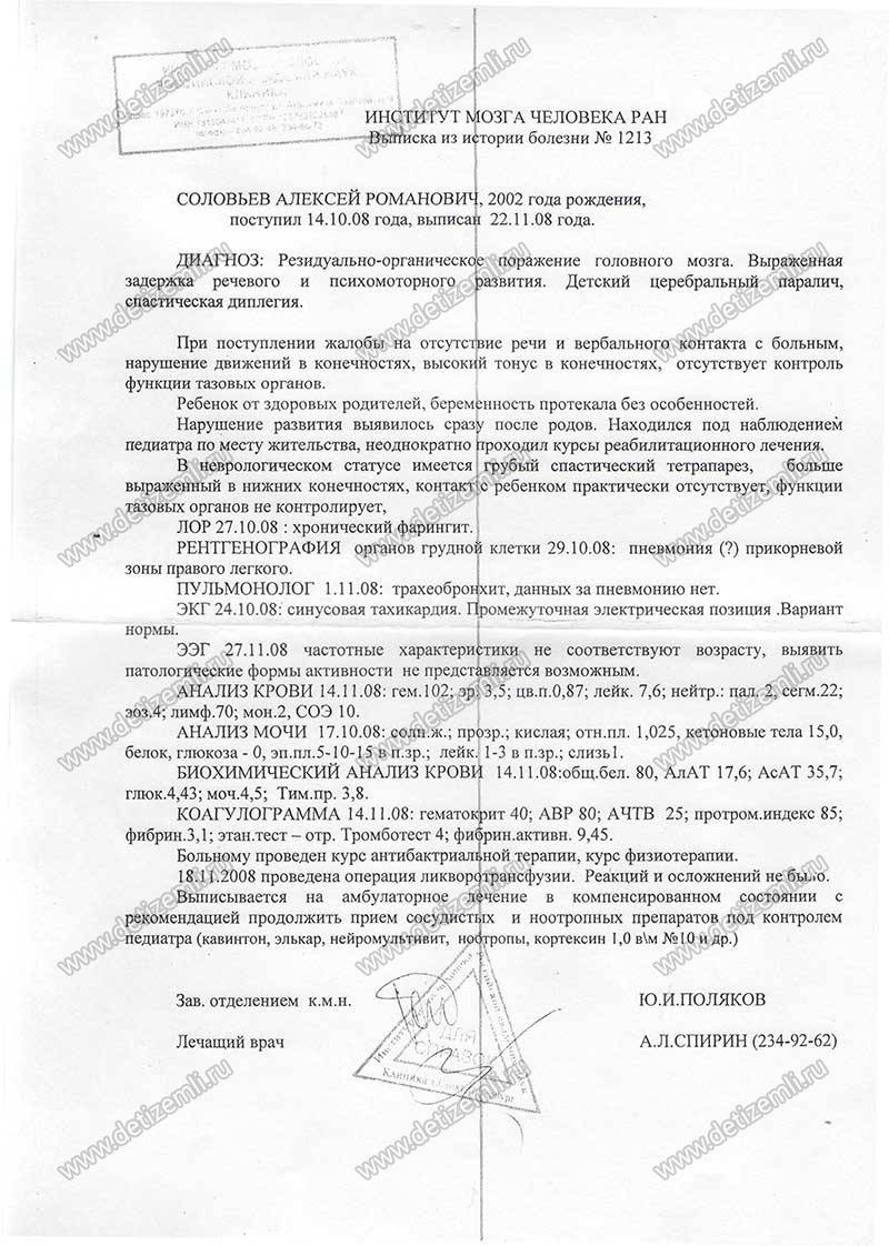 6.11.09. Оплачен курс лечения Соловьева Алеши в клинике Института мозга человека г. Санкт-Петербург в сумме 50 000 рублей. Вероника Александровна и Алеша, успехов вам и с Богом!