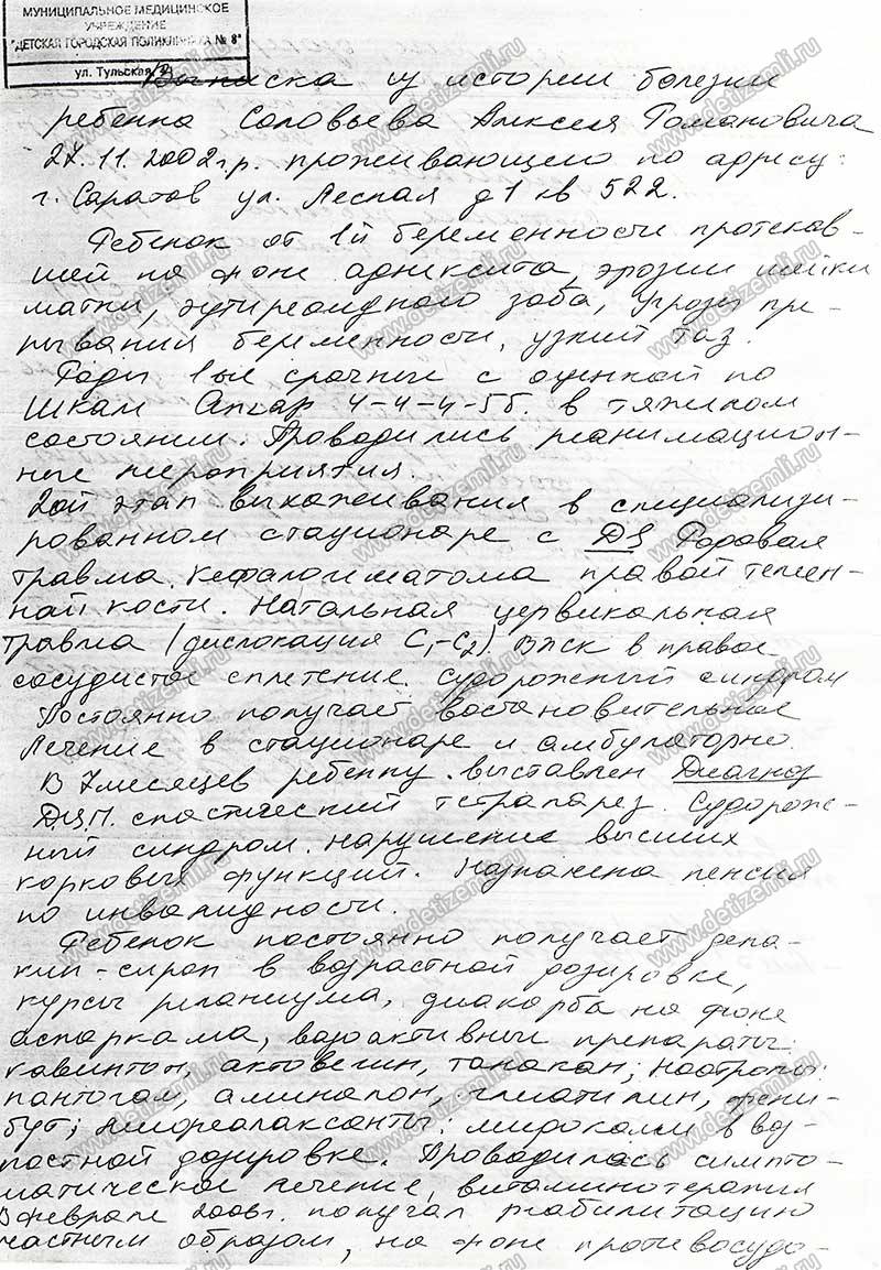 Хочу выразить вам большую благодарность за оказанную помощь моему сыну Соловьеву Алеше. Благодаря вашему фонду, Алешке была проведена операция. Хочу напомнить, что Алеше 7 лет, у него тяжелая форма ДЦП, спастический тетрапарез. В 7 месяцев сыну дали инвалидность и каждые два года мы проходили комиссию МСЭК, а в сентябре 2009г. Алеше дали инвалидность до 2020 года, т.е. до совершеннолетия. Алексей постоянно нуждается в лечении: массажи, таблетки, уколы и каждые полгода операция в г. Санкт-Петербурге. Я не в состоянии полностью оплачивать лечение Алеши. Сына я воспитываю одна. Пока я на работе с ним занимаются мои родители. Пенсия ребенка и моя зарплата уходят на питание и массаж. Сейчас Алеше нужны таблетки "глиатилин", которые стоят 800 рублей за 14 капсул. Одной капсулы хватает на день, а курс три месяца. Благодаря таким людям, как Вы, мой сынок лечится. Без помощи вашего фонда мы не смогли бы съездить на операцию в Питер. Сотрудники фонда "Дети Земли" - люди, которые воспринимают чужую беду, как свою. Директор фонда Наталья Александровна лично позвонила мне, чтобы узнать когда мы планируем ехать на операцию. Она очень сильно переживала за Алешу. 15 декабря 2009г. мы приехали в Питер на операцию, которая прошла без осложнений, а 20 декабря мы вернулись в Саратов. Следующая операция назначена на август 2010 года. Низкий поклон всем людям, которые помогали собирать деньги на лечение Алеши. Только благодаря вашему фонду у нас появилась надежда на выздоровление. Хочу поздравить всех с наступающим Новым годом. И пожелать всем богатырского здоровья. Огромное спасибо вам за помощь, оказанную Леше. Храни вас Бог! Надеюсь, что и в дальнейшем вы сможете помогать больным деткам. Может кто-то еще захочет оказать помощь моему сыну. Мы будем очень благодарны за помощь. Спасибо фонду "Дети Земли", успехом вам в вашей не легкой работе. Низкий вам поклон! До свиданья.