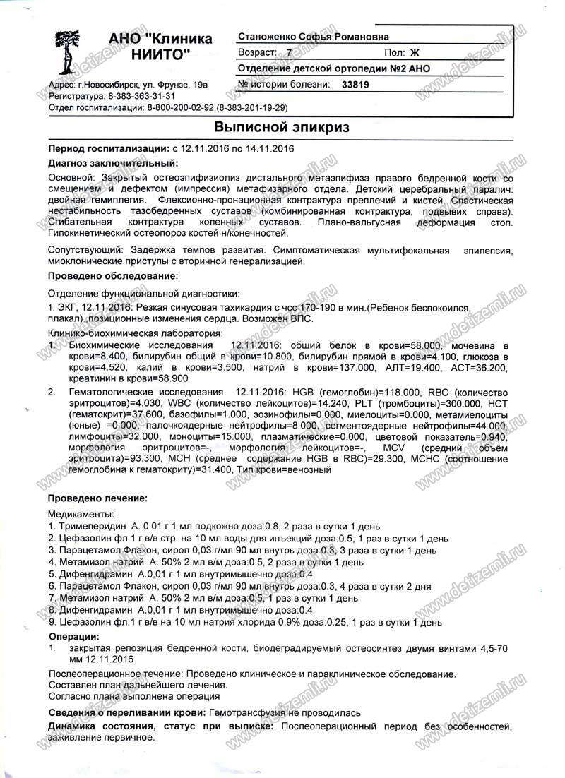 Оплачено лечение Станоженко Софии