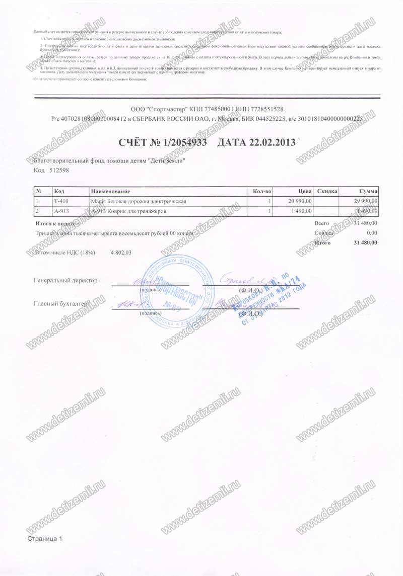 Оплачена беговая дорожка для реабилитации Ани стоимостью 31480 рублей.