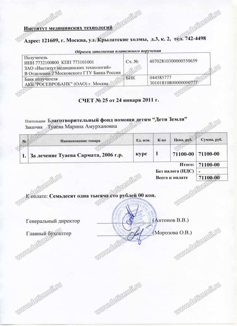Оплачено лечение Сармата в Институте медицинских технологий стоимостью 71 100 рублей.