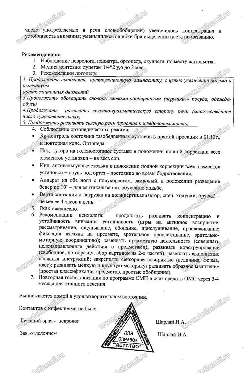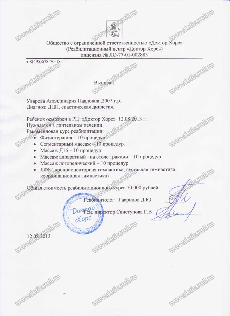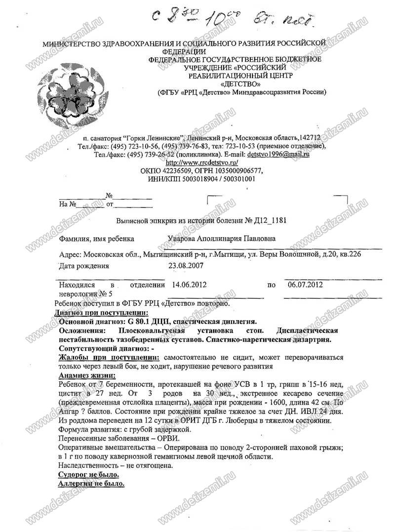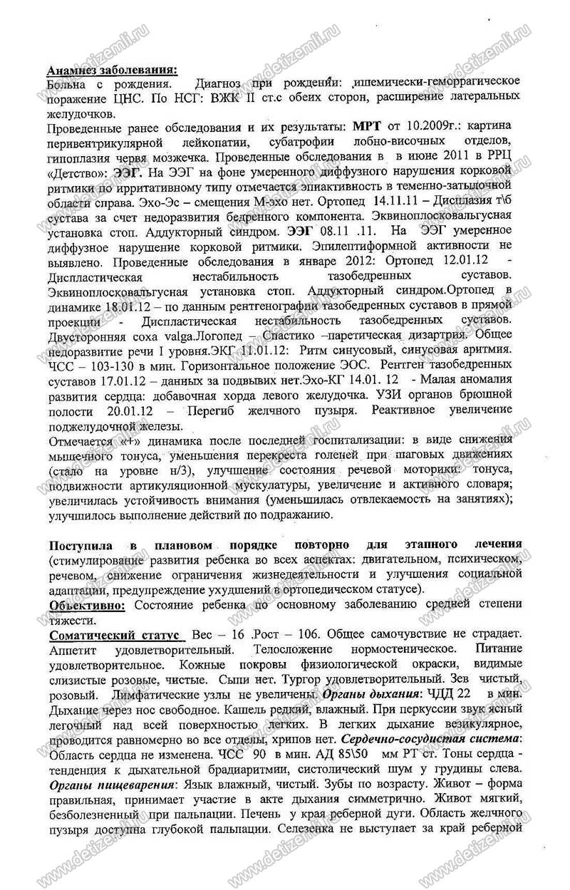 Заболевание моей дочери — это совпадение многих обстоятельств и перенесенные мною грипп и цистит, ошибки и беспечное отношение акушеров, которые принимали роды. Длительный период обезвоживания и очень поздно сделанное кесарево сечение. Затем около месяца Полина была на ИВЛ — это ей лечили двухстороннею пневмонию. Затем моей дочурке пришлось пережить гидроцефальный синдром — неминуемое явление, как результат поражения сосудов головного мозга. Так, что внутриутробная гипоксия добавочная. Халатность местных педиатров, которые утверждали, что ребенок здоровый, просто недоношенный (28 недель), ослабленный. Все пришло к тому, что в годик она не могла держать голову не могла сидеть. Но она всегда была очень жизнерадостным, улыбчивым ребенком. К 5 годам она стала разговаривать. Лечение Полины приходило в 18 больнице и РЦ «Детство». Но результаты были незначительными. В прошлом году благотворительный фонд Милосердия собрал средства на лечение в Китае. В мае—июне 2013 года мы были в Китае. Есть большие результаты. Но наш диагноз (спастическая диплегия — это спастика двух конечностей) просто так не уходит, при ходьбе она перекрещивает ножки и не может держать равновесие при сидение на стуле. Необходимо сделать операцию по методу Ульзибата, а через 2 месяца нужна хорошая реабилитация. Мы выбрали клинику Доктор Хорс, так как на поездку в Китай нам рассчитывать не придется — фонд Милосердия не берется за нас. Дорогие люди! У моей дочери очень большей потенциал, каждая реабилитация, каждое приложенное усилие по ее восстановлению не проходят бесследно, дают всегда
