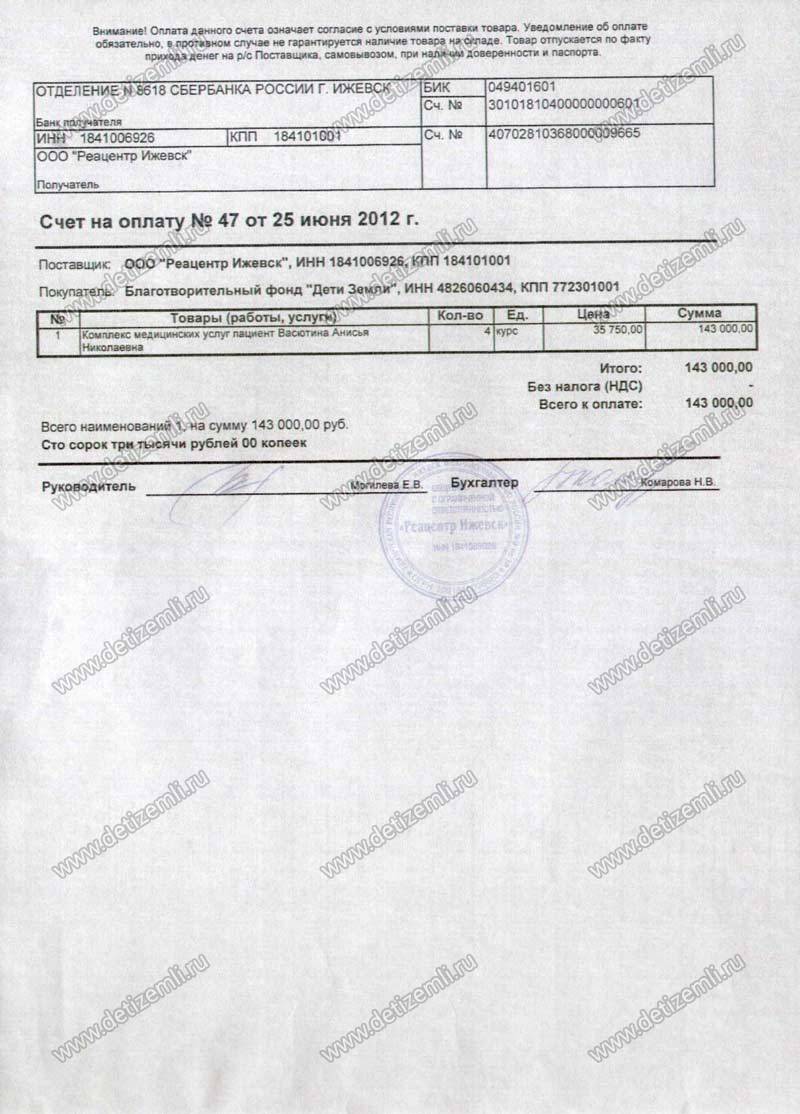 Оплачено лечение Анисьи в "Реацентре" стоимостью 143000 рублей.
