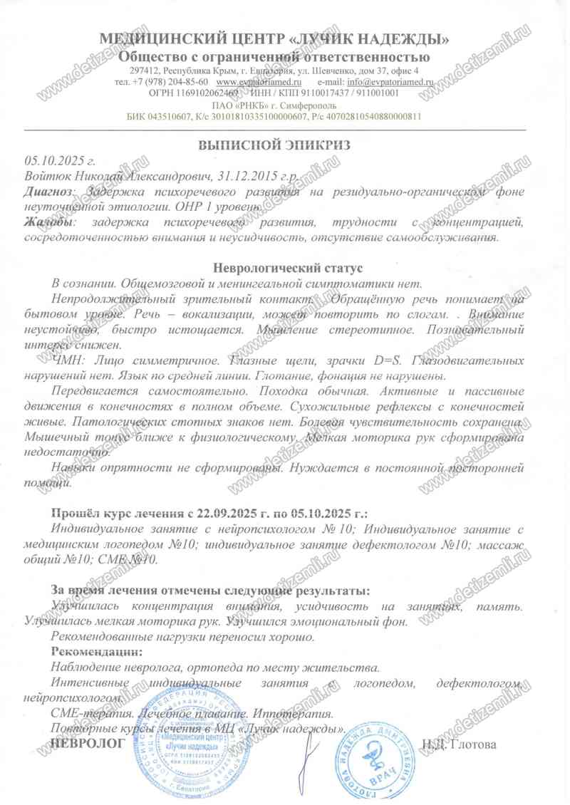 После реабилитации в МЦ «Доктрина», было рекомендовано проходить коррекционно-логопедические курсы для закрепления достигнутой положительной динамики. Поэтому начиная с 2020 г. по настоящее время, мы по мере финансовых возможностей проходили курсы в Коррекционно-логопедическом центре Марии Черняк г. Рязань, в медицинском центре ООО «МЦ «ЛУЧИК НАДЕЖДЫ»» г. Евпатория, в лечебно - оздоровительном центре для людей с ограниченными возможностями Адели-Пенза г. Пенза, в Учебном центре «Моя планета» г. Сочи, в центре сенсорной интеграции и нейрокоррекции «Энергия детства» в г. Воронеж, в адаптационном центре детей-инвалидов «Я могу!» в г. Карачаевск. в центре «Территория речи/Умник» в г. Рязань.