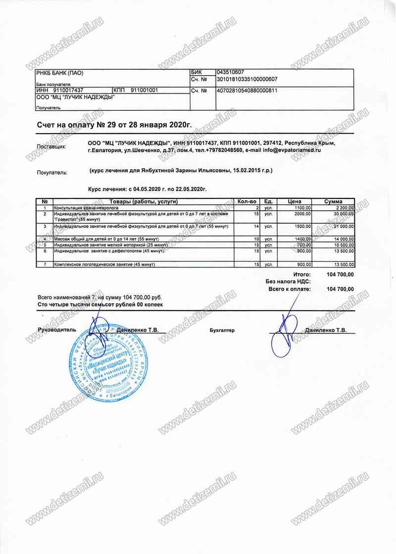 Оплачено лечение стоимостью 104700 рублей.