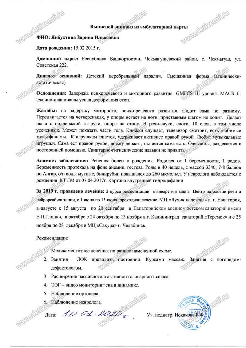 Уважаемый, благотворительный фонд «Дети земли», обращаюсь к вам за помощью, которая нужна моей дочери Янбухтиной Зарине Ильясовне. Она родилась 15 февраля 2015 года. Весом 3340, рост 52. Апгар 7/8 баллов. Беременность протекала без осложнений, родилась в срок и все казалось было хорошо. С первого месяца у нас были проблемы с прибавкой в весе из-за слабого сосательного рефлекса, начала громко плакать в результате эмоционального стресса у меня пропало молоко, около 2-х месяцев перешли на искусственное питание. Но вес набирали по-прежнему плохо, стало наблюдаться отставание в развитии - в полгода не держала голову, ничего не брала в ручки, не переворачивалась, не сидела.
